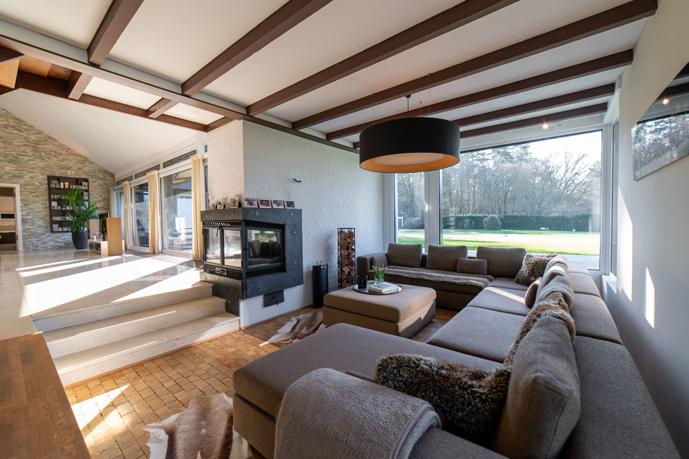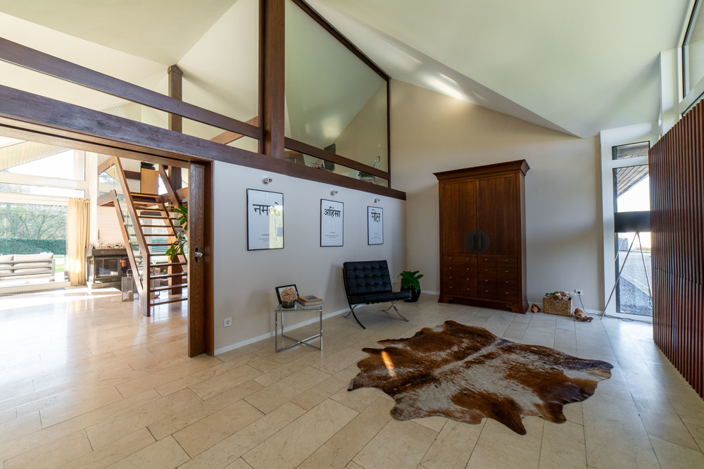 Im Jahr 2015 wurde das Anwesen umfassend kernsaniert und präsentiert sich heute in makellosem Zustand. Bereits beim Betreten des Hauses werden Sie von einem repräsentativen Entrée empfangen, welches mit hohen Decken überzeugt. Der Wohnbereich des Hauses beeindruckt durch eine moderne Chill-Lounge mit einer Kaminecke, die zum Entspannen und Verweilen einlädt. Bodentiefe Fenster ermöglichen amtemberaubende Ausblicke auf das weitläufige Grundstück und durchfluten die Räume mit viel natürlichem Licht. Zusätzlich sorgt die Galerie für eine besondere Atmosphäre und mehr Raum für Individualität.