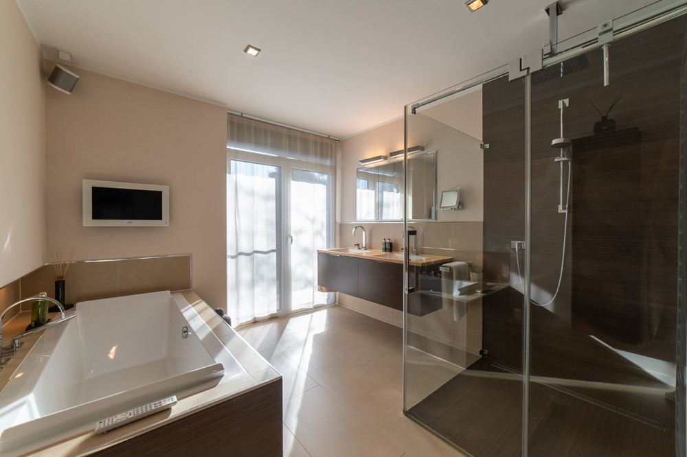 - Luxuriöses Badezimmer mit Dornbracht Armaturen und einer XL-Glasdusche aus dunkelbraunem Marmor mit Dornbracht digitaler Smart-Dusche und Rainshower, Villeroy & Boch Dusch-WC und Starck-Badewanne, Handtuchheizkörper, eingebauten Badezimmermöbeln und Fernseher
