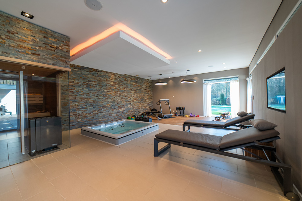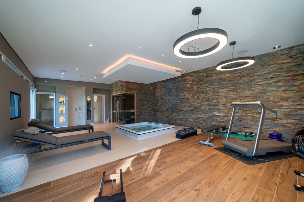 Für mehr Entspannung und Erholung sorgt der Wellness- und Spa-Bereich, welcher mit einer finnischen Bio- und Dampfsauna, einer Dusche, einem Whirlpool von Villeroy & Boch und einem Fitnessbereich ausgestattet ist. Der Bereich bietet einen direkten Zugang in den Garten und lädt zum Verweilen und Entspannen ein. Zudem befindet dort stillgelegter 8x4 m Pool, der bei Bedarf wieder reaktiviert oder zurückgebaut werden kann.