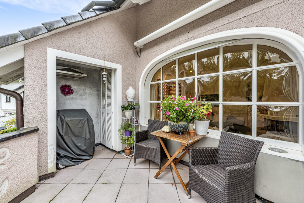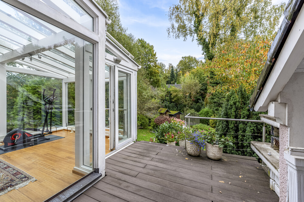 Ein weiteres Highlight ist die Sauna auf dem Balkon, die private Wellnessmomente in ruhiger Umgebung ermöglicht. Der lichtdurchflutete Wintergarten mit Blick ins Grüne schafft zusätzlichen Raum für Erholung und vielseitige Nutzungsmöglichkeiten – ob als Frühstücksbereich, Atelier oder Rückzugsort.