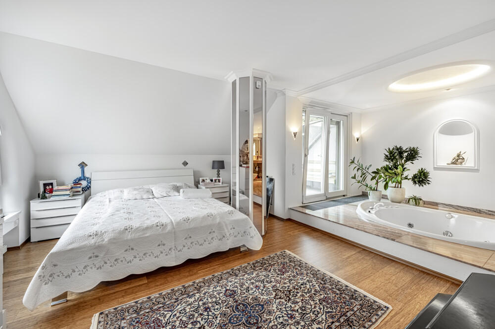 Im Schlafzimmer befindet sich ein modernes Bad en suite mit einer großzügigen, bodentiefen Badewanne, das Komfort und Privatsphäre auf hohem Niveau bietet.
