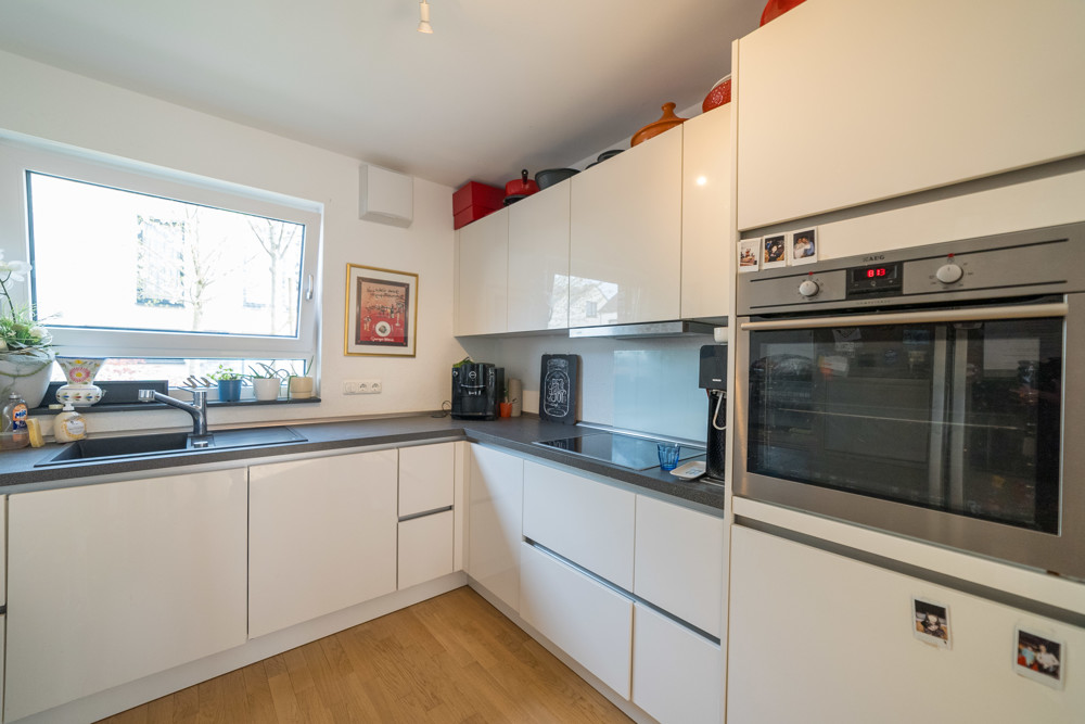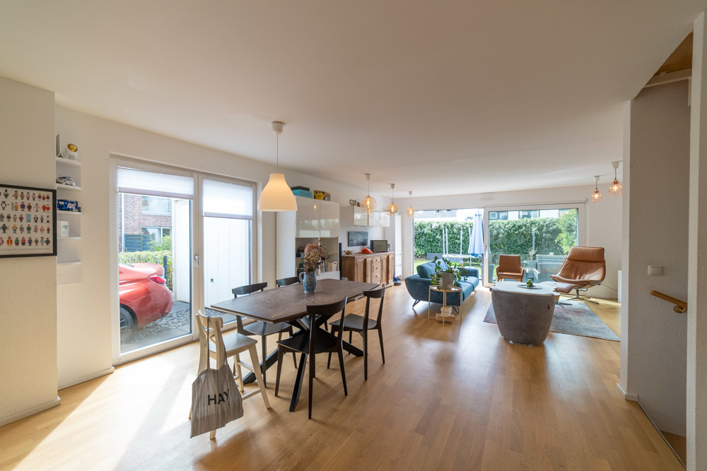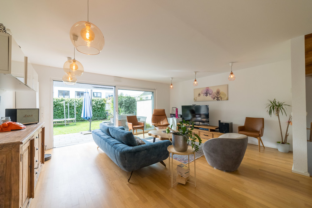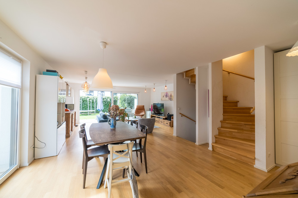 Im Erdgeschoss befindet sich ein offener Wohn-, Ess- und Kochbereich, der dank großer Fensterfronten viel Tageslicht erhält und einen direkten Zugang zur Terrasse und zum Garten bietet. Die Küche ist modern ausgestattet und verfügt über hochwertige Geräte. Ein Gäste-WC befindet sich ebenfalls auf dieser Ebene.