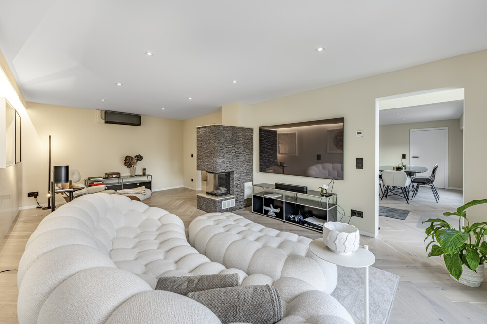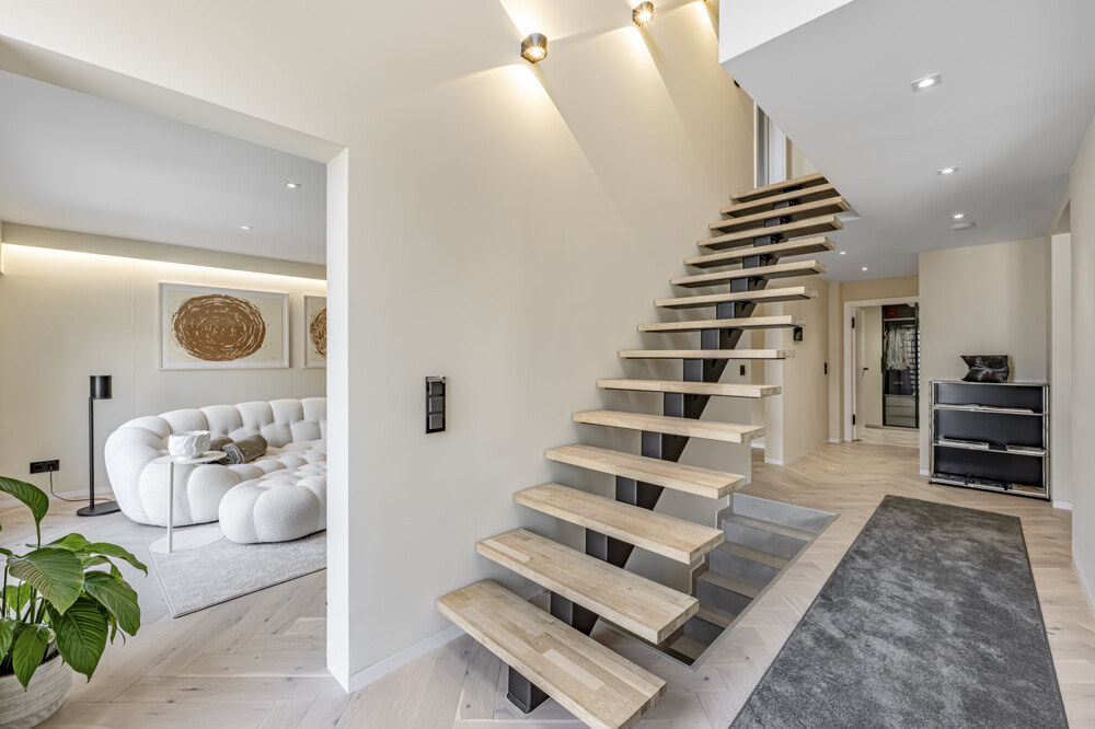 Bereits im Erdgeschoss empfängt Sie ein durchdachtes Raumkonzept, welches Offenheit und Gemütlichkeit harmonisch vereint. Der lichtdurchflutete Wohnbereich mit stilvollem Kamin schafft eine einladende Atmosphäre für entspannte Abende wie auch für gesellige Runden. Die angrenzende Design-Küche lässt keine Wünsche offen und wird zum Herzstück des Hauses.