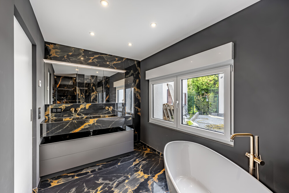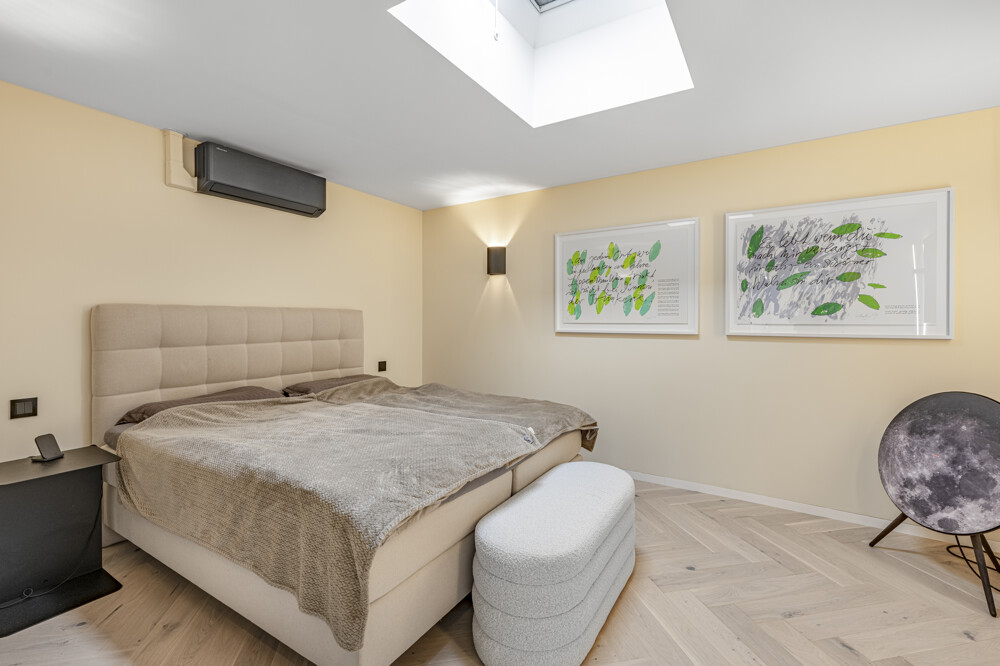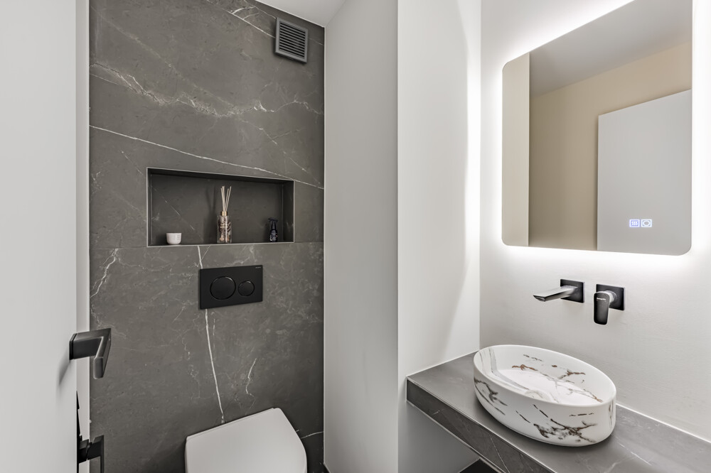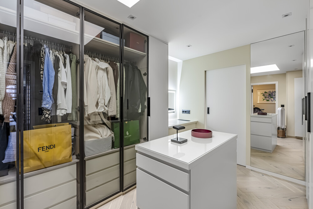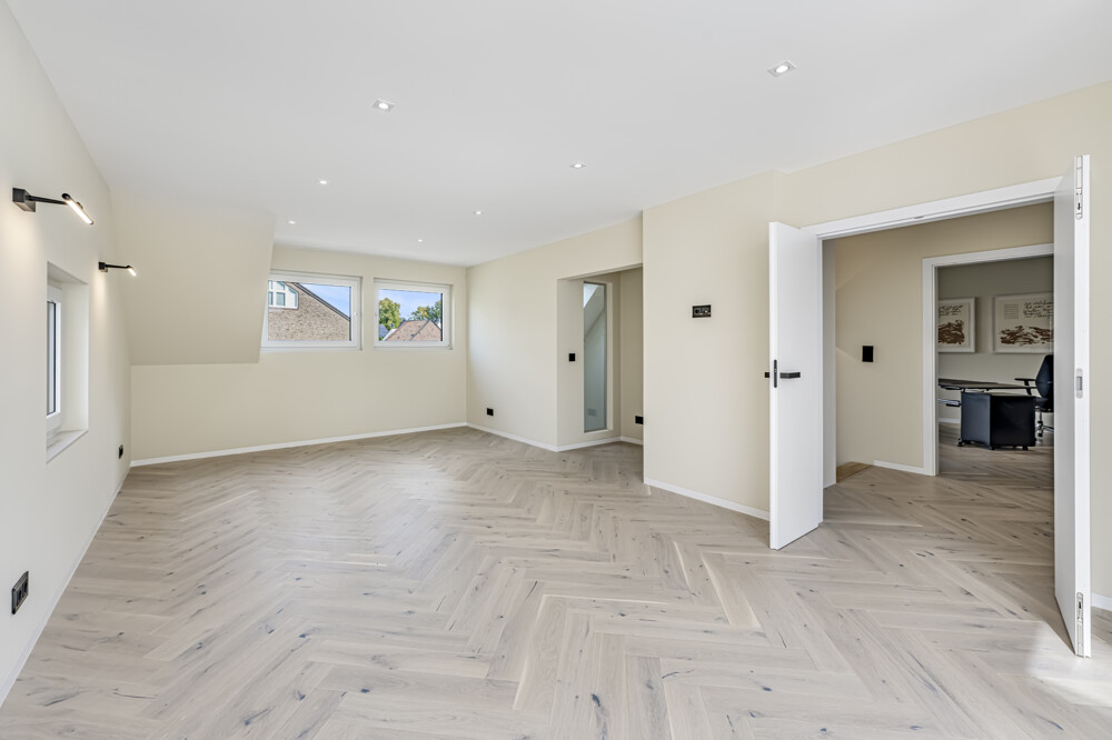 Auf gleicher Ebene befindet sich ein separates WC sowie der private Masterbereich: ein großzügiges Schlafzimmer mit direktem Zugang zur begehbaren Ankleide und einem exklusiven En-Suite-Bad. Ausgestattet mit freistehender Wanne, großformatiger Rainshower-Dusche und stilvollen Details, verspricht dieser Bereich pure Erholung in luxuriösem Ambiente.
