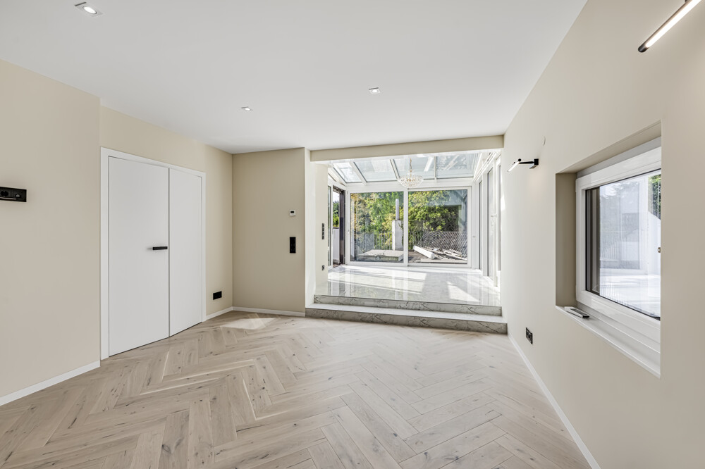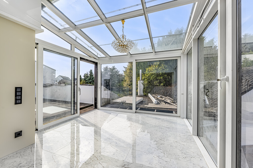 Das Obergeschoss bietet drei vielseitig nutzbare Zimmer – ideal als Kinder-, Arbeits- oder Gästezimmer – sowie ein hochwertiges Duschbad für Gäste. Der angrenzende Wintergarten schafft einen lichtdurchfluteten Rückzugsort mit direktem Zugang zur großzügigen Dachterrasse – Ihrer privaten Ruheoase mit Blick ins Grüne.
