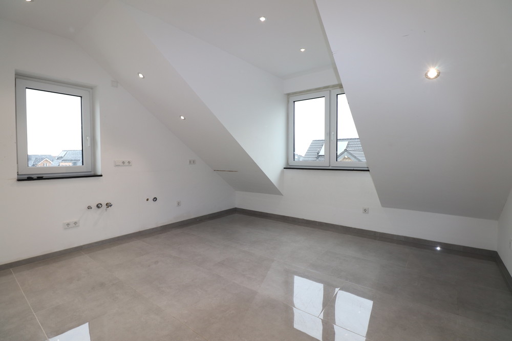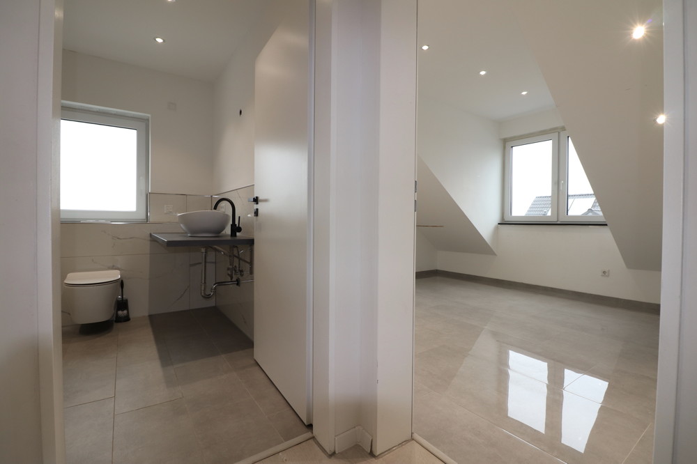 Am Ende des Flures, über den Sie auch Zugang zum Spitzboden für mehr Stauraum erlangen, befindet sich das Badezimmer - ebenfalls mit einer bodentiefe Dusche und Waschmaschinenanschlüssen.