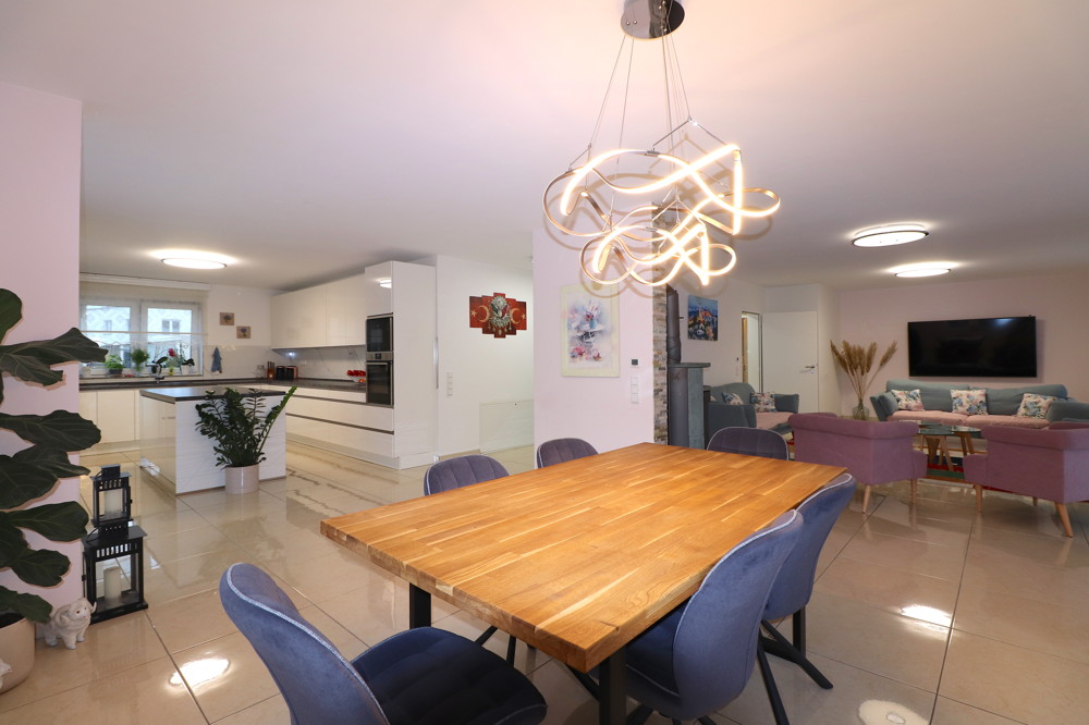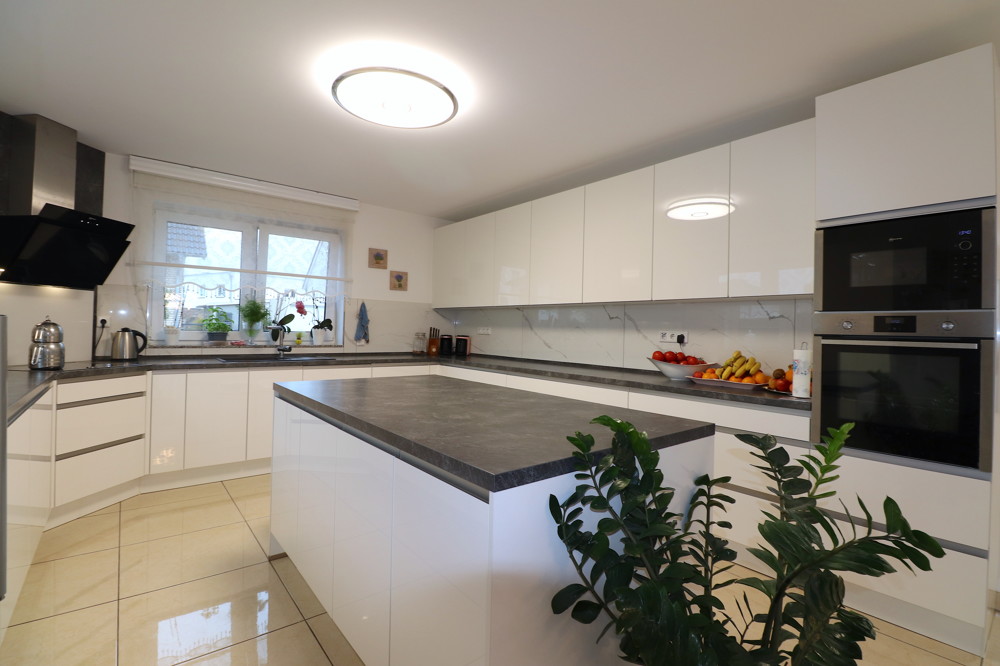 Das Erdgeschoss ist in wunderschönen großformatigen beigen Steinböden ausgestattet. Sie werden von der Großzügigkeit überwältigt sein, wenn Sie das Wohnzimmer mit bodentiefer Fensterfront mit Blick in den Garten und angrenzender Wohnküche betreten. Die hochwertige Küche ist mit Einbauelektrogeräten der Firma Neff ausgestattet, in edlen hellen Fronten und einer anthrazitfarbigen Arbeitsplatte designed und besticht durch eine praktische, aber auch sehr repräsentative Kochinsel. Der Küchenspiegel ist in einer weißen Mamoroptik gefliest und gewinnt an Wärme durch die in naturfarben abgesetzte Granit-Fensterbank.
