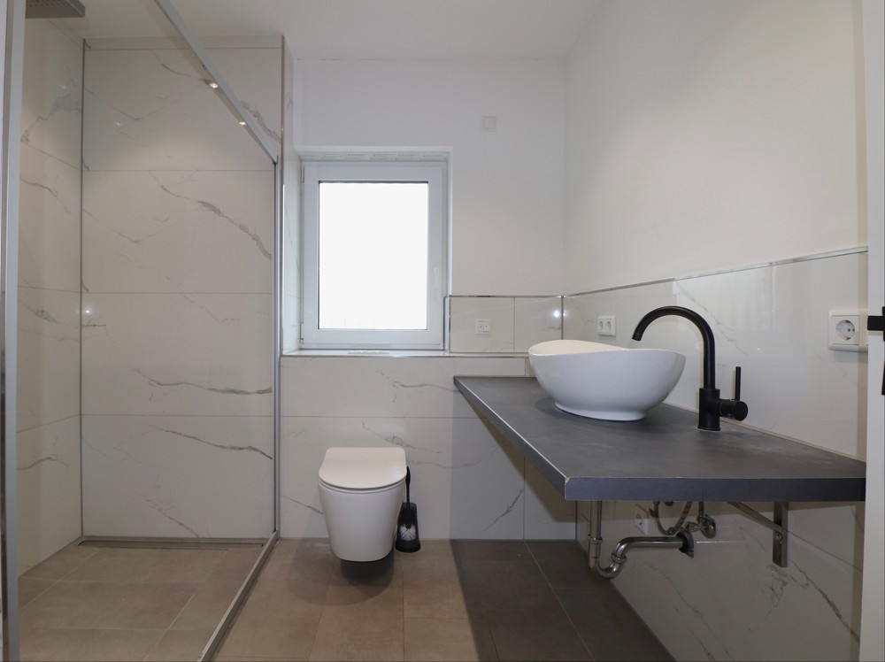 Des Weiteren befindest sich in dem über 110m² großen Erdgeschoss ein geräumiges in Steinfliesen ausgestattetes Badezimmer mit bodentiefer Dusche, sowie ein toll geschnittenes Schlafzimmer.