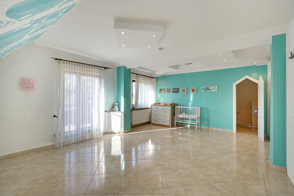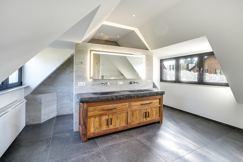 Gegenüberliegend befindet sich das Kinderzimmer, sowie das dahinter gelegene Elternschlafzimmer mit einem eindrucksvollen Bad en Suite. Dieses besticht durch modernsten anthrazitfarbigen Sandsteinboden, einer farblich abgestimmten Rain-Shower Dusche mit integrierten Massagedüsen und einem Doppelwaschbecken, eingelassen in einen aus Indonesien angelieferten Holzwaschtisch in feinster Qualität. Das Schlafzimmer ist in charakteristischem Echtholzparkett ausgestattet und versprüht die Wärme von Landhauscharme. Die bisherigen Eigentümer haben Liebe zum Detail bewiesen und keine Kosten und Mühen gespart, um Ihr zukünftiges Zuhause zu einer Wohlfühloase zu machen.