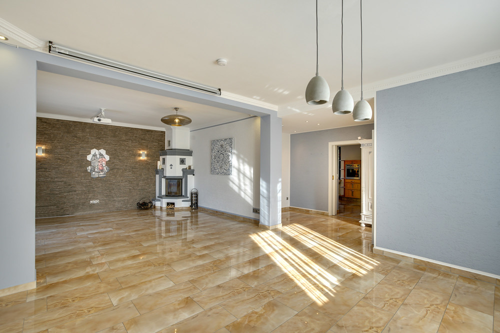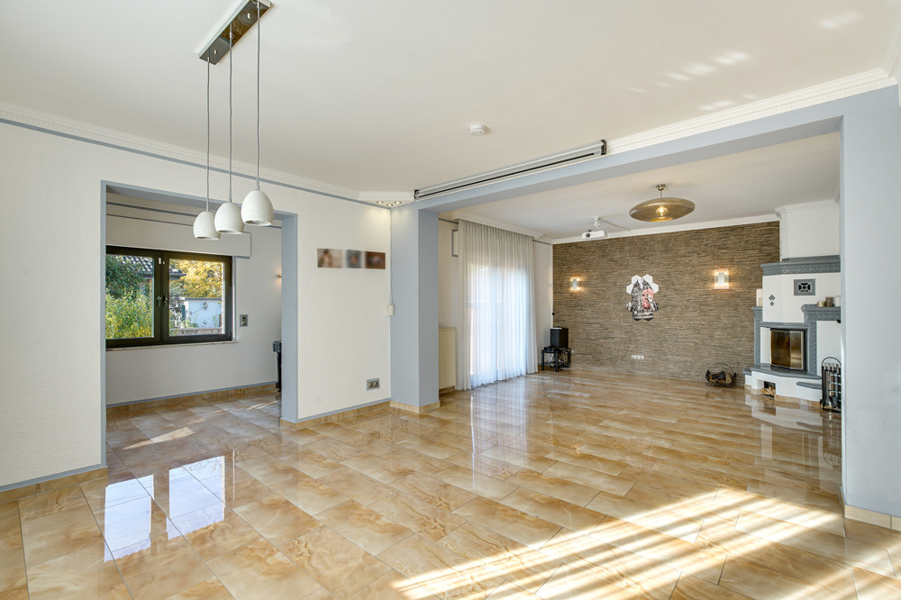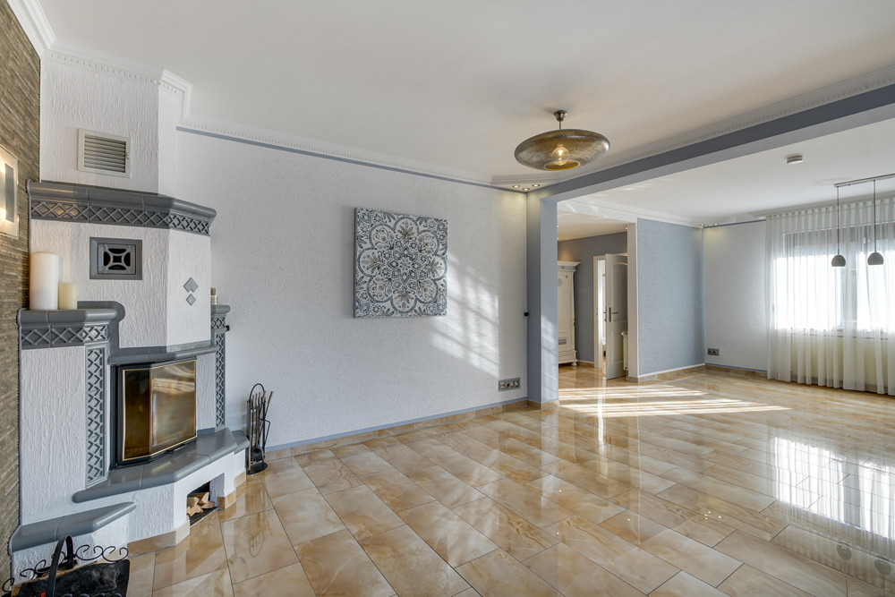 Sie betreten das großzügig geschnittene Erdgeschoss, welches einheitlich in terracotta farbigen, hochglänzenden Mamorböden erstrahlt. Große Fenster, ein offener Kamin und ein geräumiges Wohnzimmer laden zu zukünftigen Familienfeiern ein. Sie gelangen über die Terrassentür direkt auf den hinter dem Haus gelegenen romantischen Innenhof. Dieser enthält, angelehnt an die mediterranen Welt, einen eingemauerten Grill und verspricht tolle Sommerabende mit Freunden, Nachbarn und Familie.