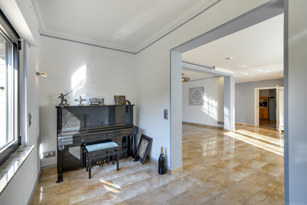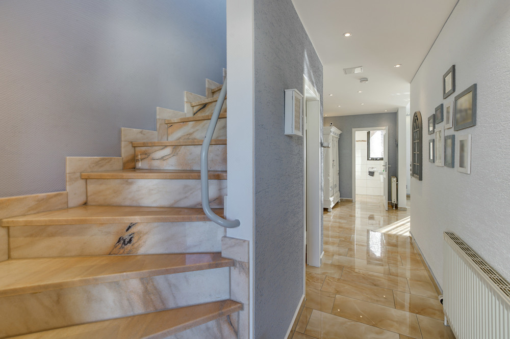 Zurück Richtung Eingangsbereich, vorbei an dem Gäste-WC, gelangen Sie über das großzügige, ebenfalls im Mamorboden ausgestattete, Treppenhaus auf die erste Etage.