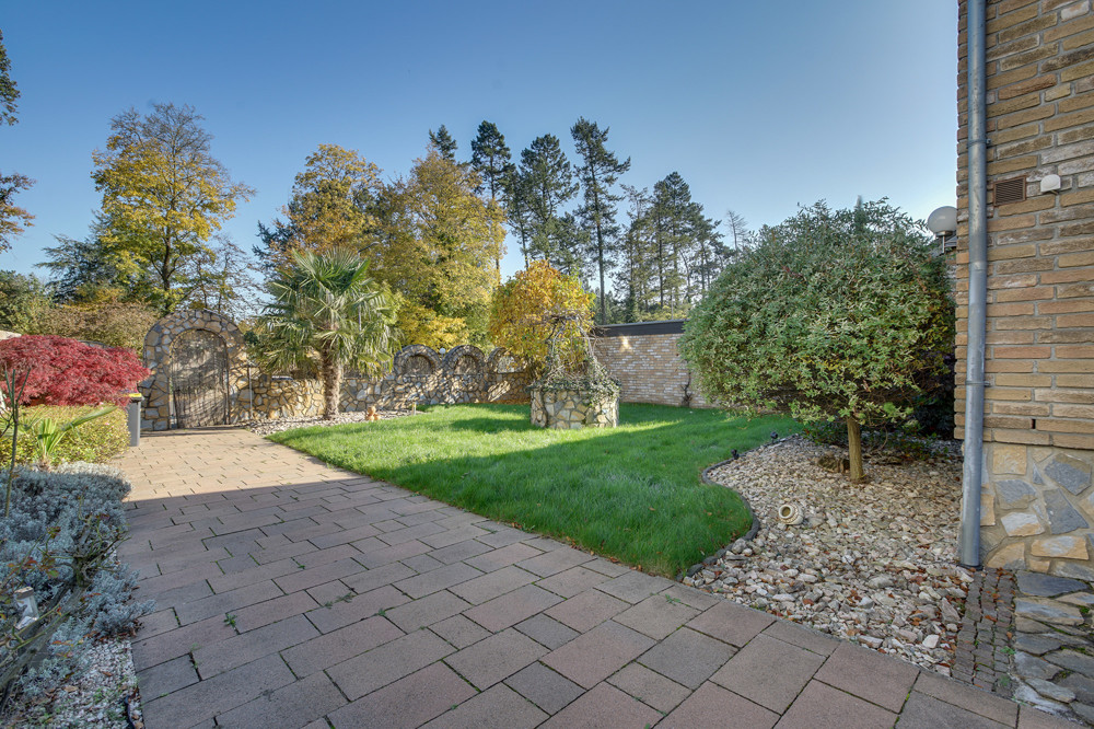 Schon bevor Sie das Grundstück betreten, besticht der Charme der extra aus Portugal angelieferten Natursteine, angeordnet in Rundbögen. Lavendel- und Olivenbäume begleiten Sie durch den liebevoll gepflegten Garten, vorbei an einem traditionell gemauerten Brunnen und einer Palme, über einen kleinen romantischen Innenhof bis hin zur Haustüre.