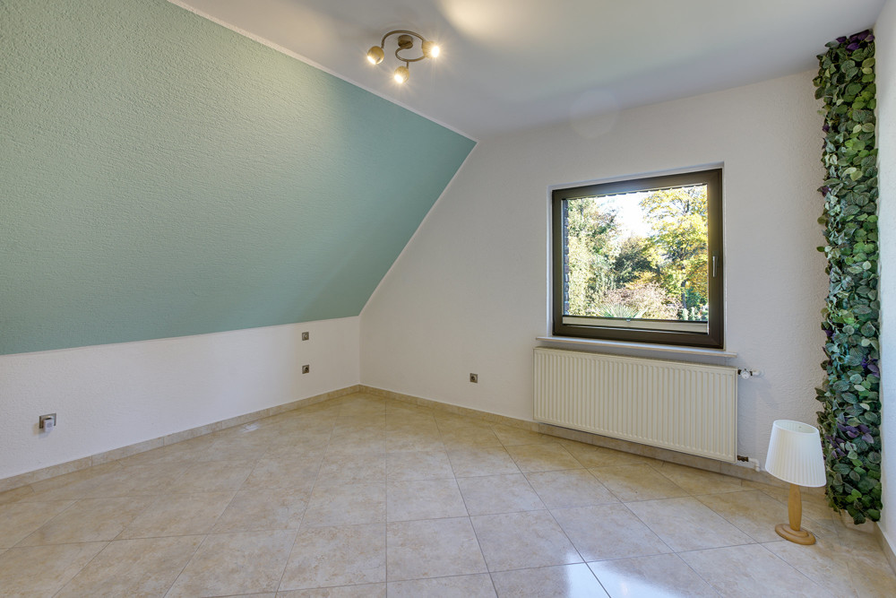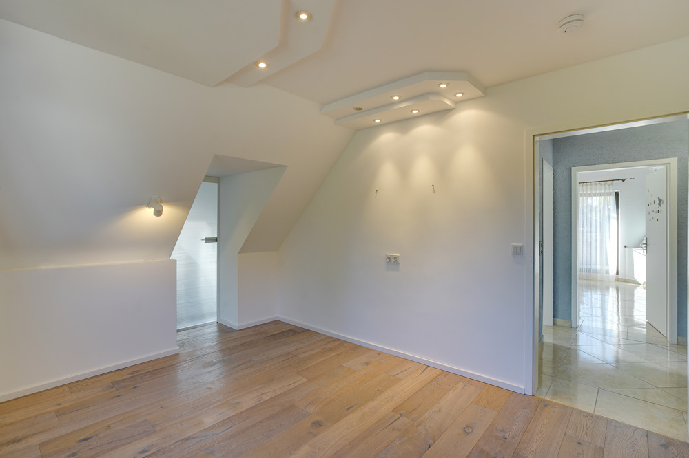 Ein weiteres Duschbad, ausgestattet mit modischen Fliesen, befindet sich vis-a-vis vom Treppenaufgang, am Ende des Flurs, und ist somit von allen Schlafräumen aus zugänglich. Von dem Treppenhaus aus, gelangen Sie über eine ausklappbare Treppe auf den bereits ausgebauten 40m² großen Spitzboden. Sie können ohne großen Aufwand das Treppenhaus erweitern, sodass Sie einen direkten Zugang zum Dachboden haben und diesen als Stauraum, oder auch als weitere Wohnfläche integrieren. Die Fläche bietet sich ideal als weiteres Schlafzimmer und/oder Hobbyraum an.
