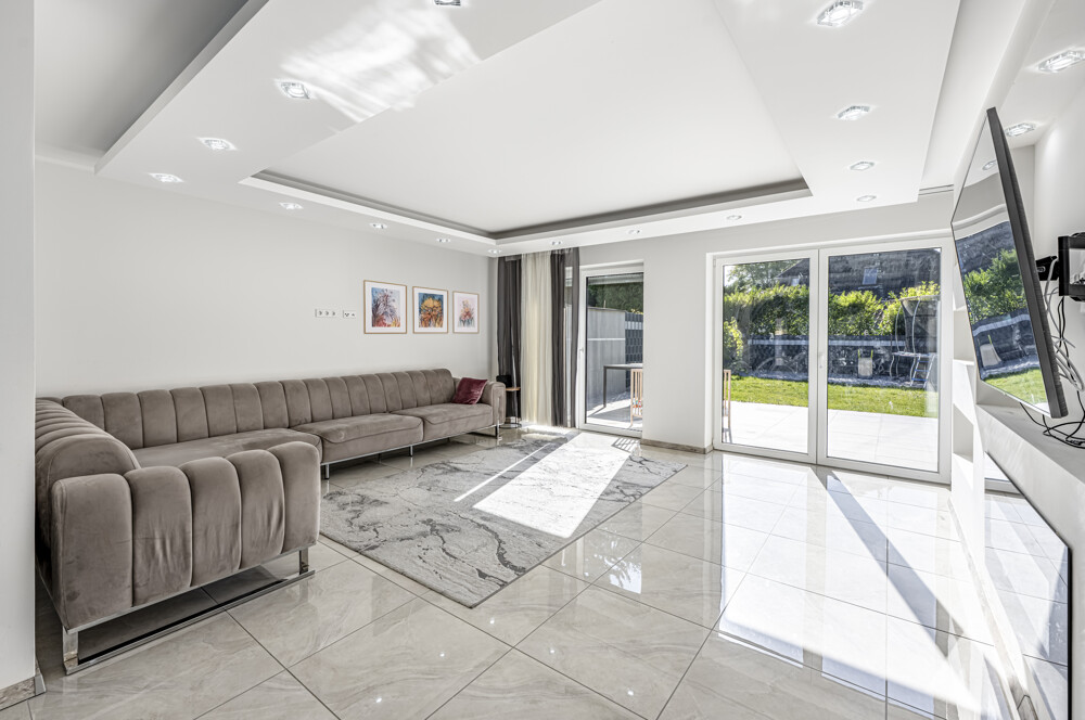 - Moderner Wohnbereich mit offenem Grundriss und raumhohen Fenstern