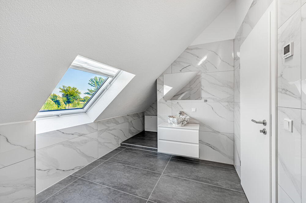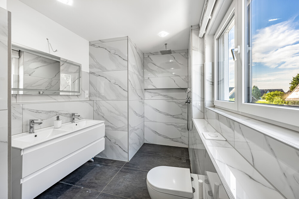 - Zwei luxuriöse Badezimmer – mit freistehender Badewanne bzw. ebenerdiger Dusche und Doppelwaschtisch