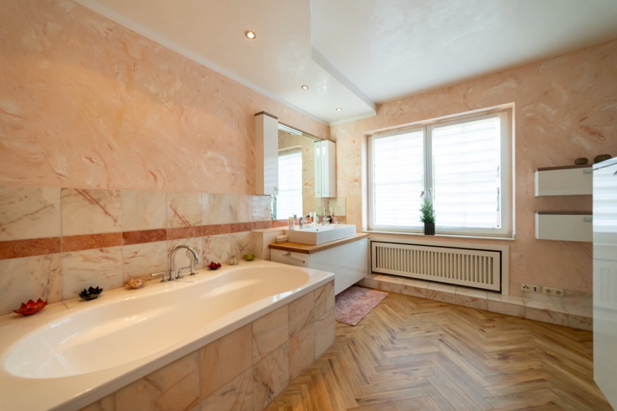 - Helles, geräumiges Badezimmer mit Dusche und Badewanne