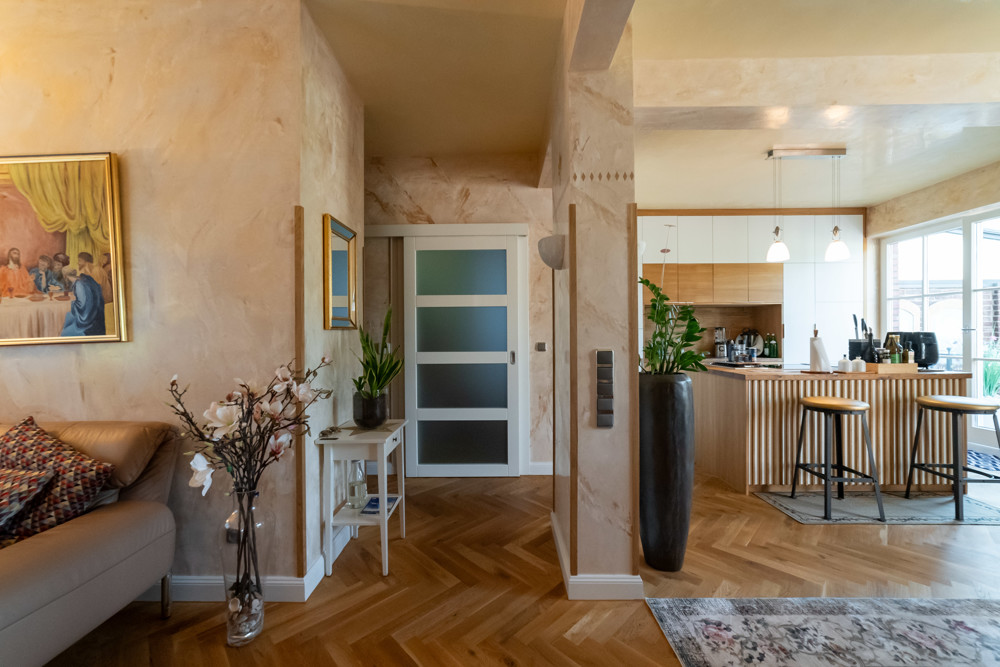 Alle Wände sind mit einer sehr teuren Malerarbeit versehen, die als "Stucco alla Veneziano" bekannt ist, eine renommierte italienische Malertechnik, die für ihre elegante und hochwertige Ausführung berühmt ist.