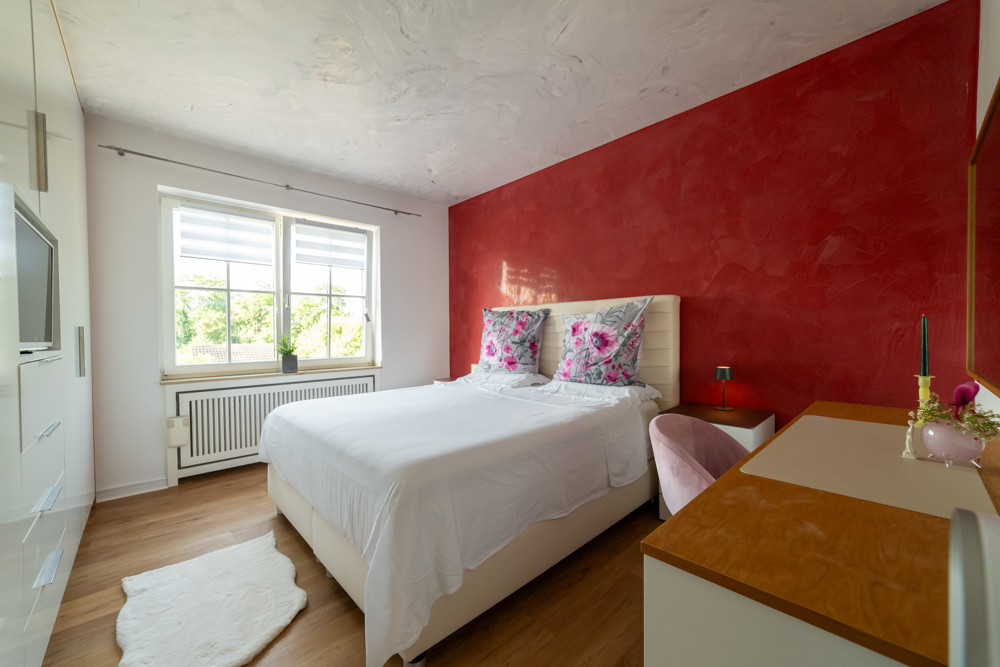 Das 1. Obergeschoss beeindruckt mit einem Ankleidezimmer, ausgestattet mit maßgefertigten Einbauschränken vom Schreiner. Das große Schlafzimmer bietet viel Raum für Erholung, während das helle, geräumige Badezimmer mit Dusche und Badewanne höchsten Komfort garantiert.