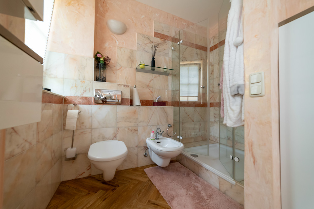 - Helles, geräumiges Badezimmer mit Dusche und Badewanne