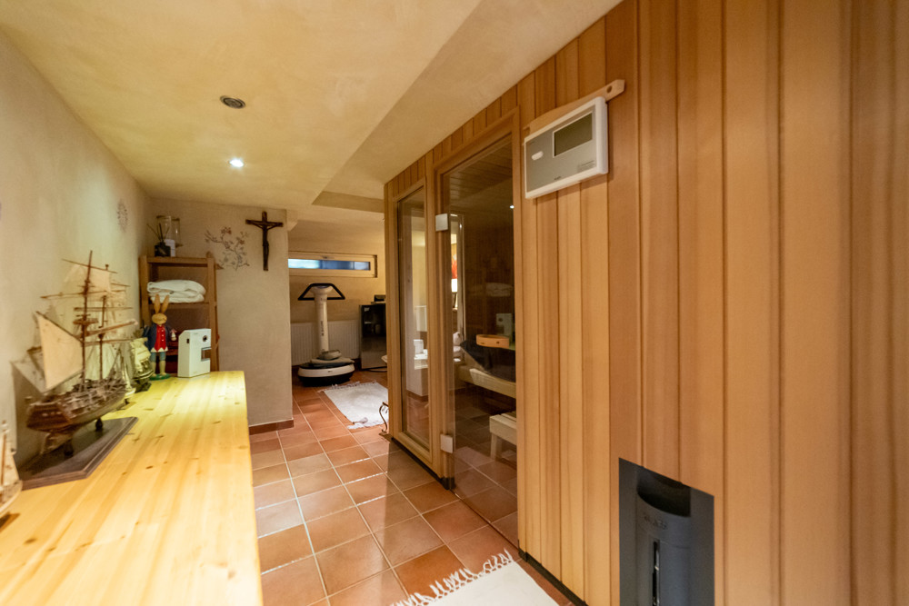 Der vollunterkellerte Bereich des Hauses bietet eine hochwertige Sauna mit einem zusätzlichen Badezimmer. Hier kann man sich nach einem langen Tag wunderbar entspannen.
