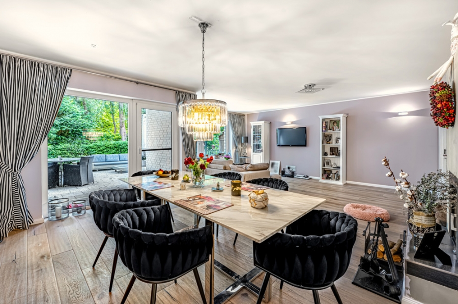 Das Herzstück des Hauses bildet der offene Wohn- und Essbereich mit direktem Zugang zur sonnigen Terrasse und dem liebevoll angelegten Garten – ein grünes Refugium mit viel Privatsphäre.