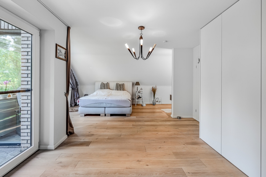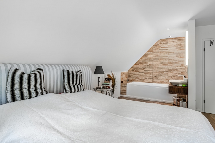 Das großzügige Masterzimmer im Obergeschoss bietet ein besonderes Highlight: ein offenes Badezimmer mit stilvoller Ausstattung, inklusive einer Whirlpoolwanne für entspannte Stunden. Zudem rundet ein privater Balkon diesen Rückzugsort ab – perfekt, um den Tag in Ruhe ausklingen zu lassen.