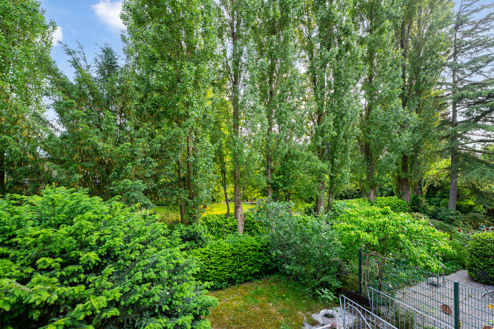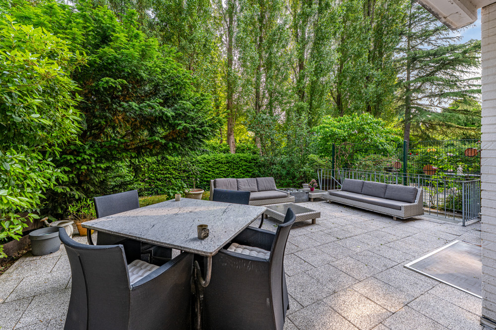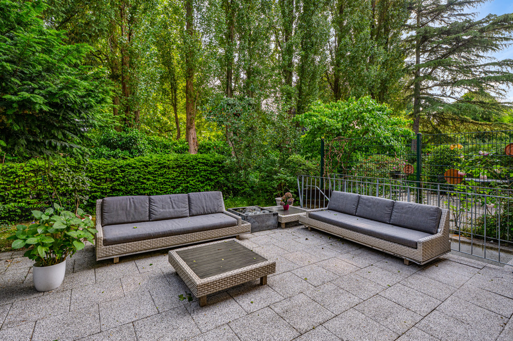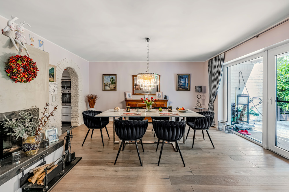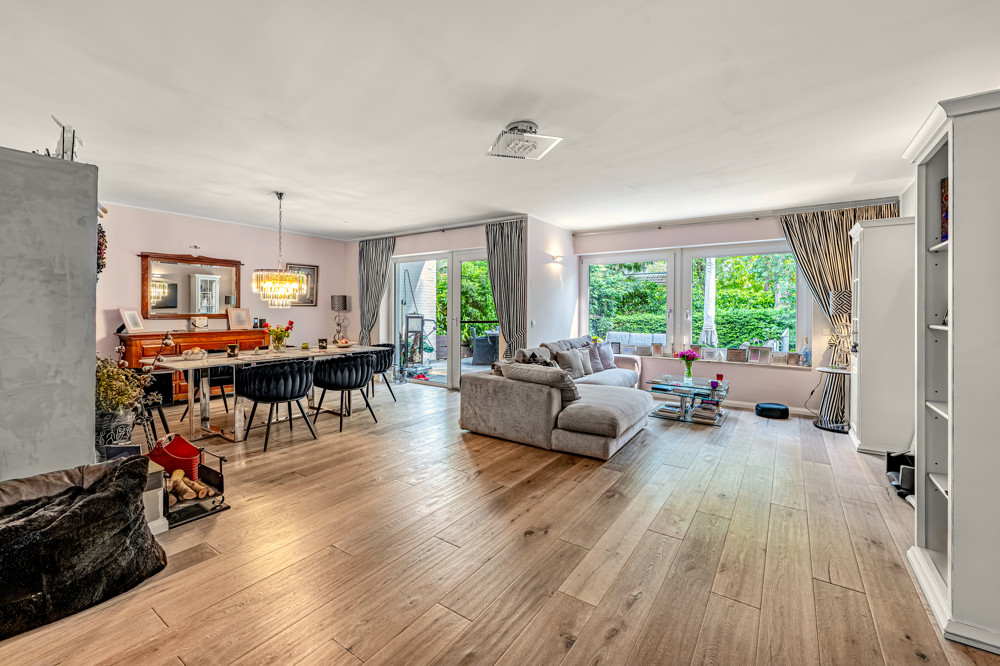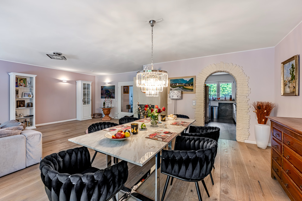 Das Herzstück des Hauses bildet der offene Wohn- und Essbereich mit direktem Zugang zur sonnigen Terrasse und dem liebevoll angelegten Garten – ein grünes Refugium mit viel Privatsphäre.