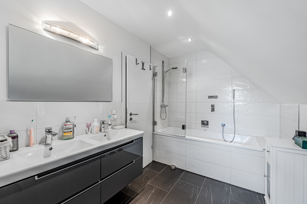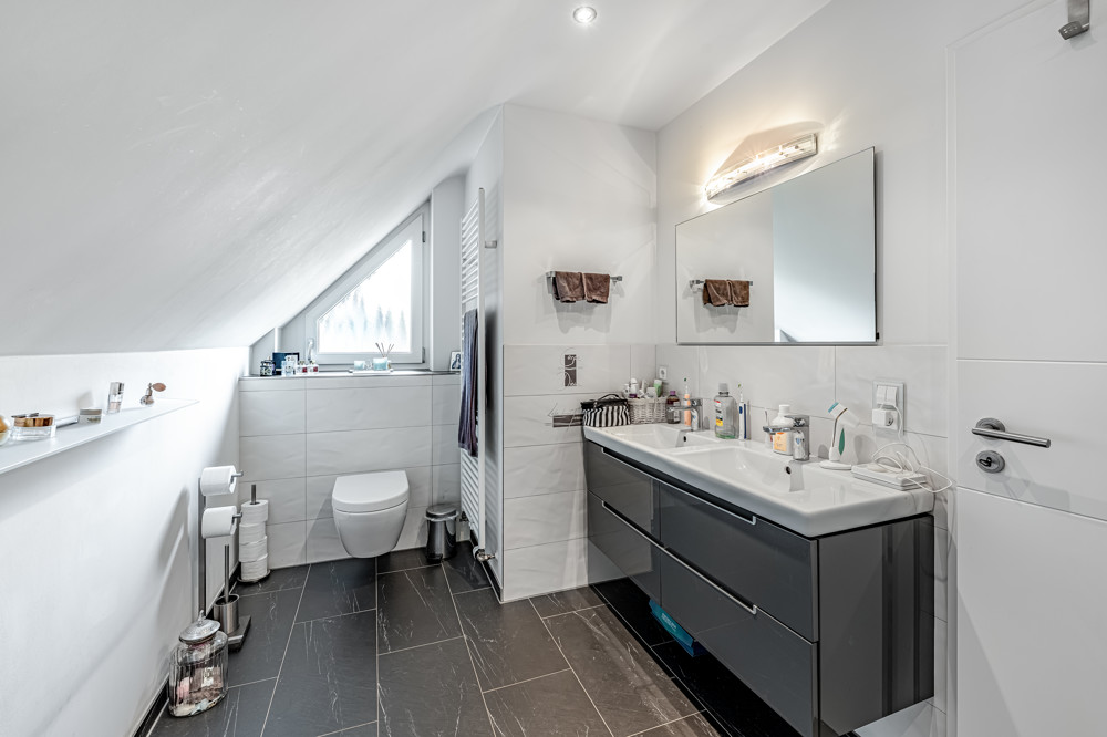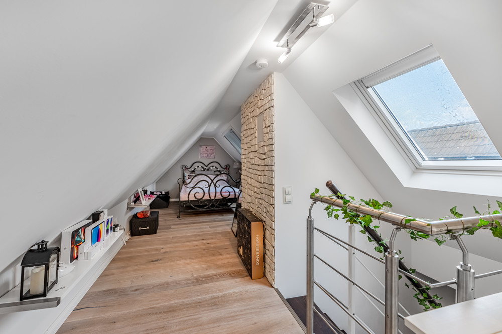 Das großzügige Masterzimmer im Obergeschoss bietet ein besonderes Highlight: ein offenes Badezimmer mit stilvoller Ausstattung, inklusive einer Whirlpoolwanne für entspannte Stunden. Zudem rundet ein privater Balkon diesen Rückzugsort ab – perfekt, um den Tag in Ruhe ausklingen zu lassen.