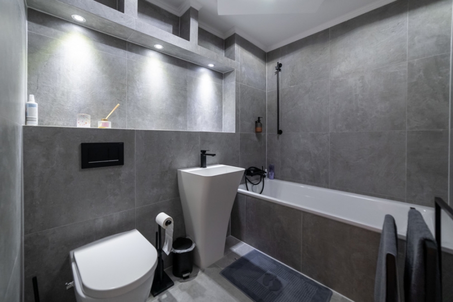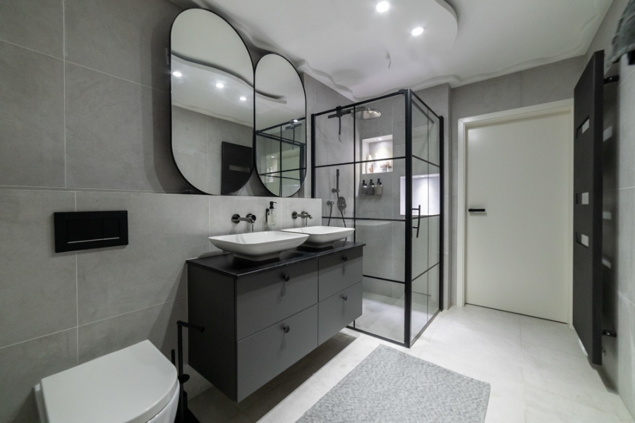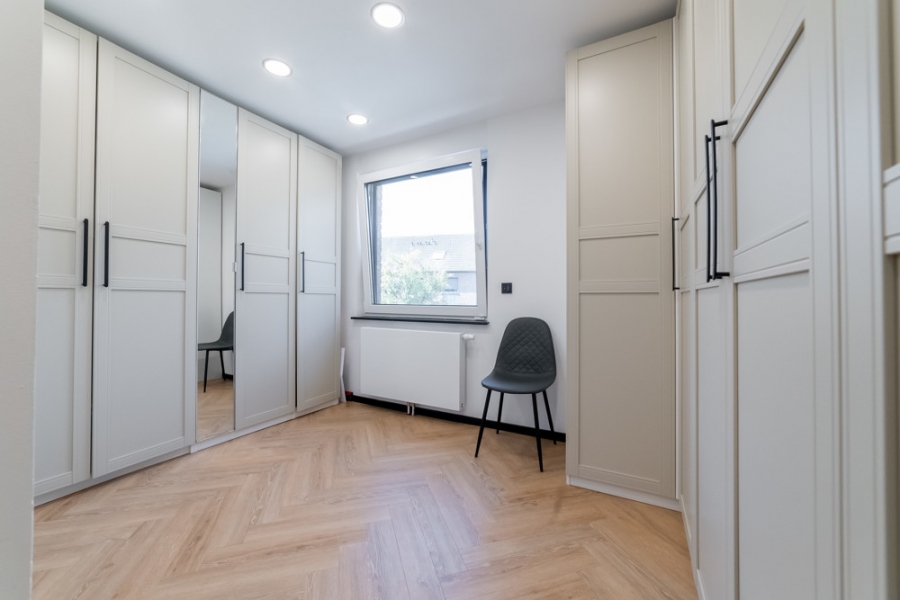 Im Obergeschoss befindet sich das private Refugium des Hauses: Das großzügige Schlafzimmer bietet genügend Platz für erholsame Nächte. Angrenzend dazu liegt ein separates Ankleidezimmer – ein Traum für jeden, der Ordnung und Stil schätzt. Das luxuriöse Badezimmer wurde mit hochwertigen Materialien ausgestattet. Auch hier ziehen sich die eleganten Grautöne und matt-schwarzen Akzente durch, die dem Raum eine moderne, entspannende Atmosphäre verleihen. Um dem Haus die gewisse Wärme zu verleihen, wurde in den Wohnräumen ein farblich abgestimmter Fischgrätenvinyl verlegt.