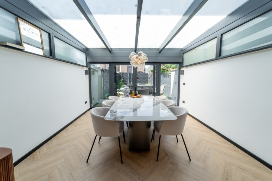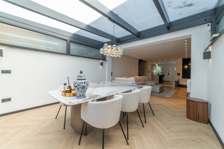 Im großzügigen Wohnzimmer finden sich moderne Holzpaneele, die eine warme und zugleich stilvolle Atmosphäre schaffen. Der angrenzende Essbereich befindet sich im offen gestalteten Wintergarten, der mit seinem lichterfüllten Raum zum Verweilen einlädt. Durch die großen Fensterflächen und den Zugang zur Loggia genießen Sie jederzeit den Blick ins Freie. Von hier aus gelangen Sie auf die geschmackvoll gestaltete Terrasse – Ihr persönlicher Rückzugsort im Freien.