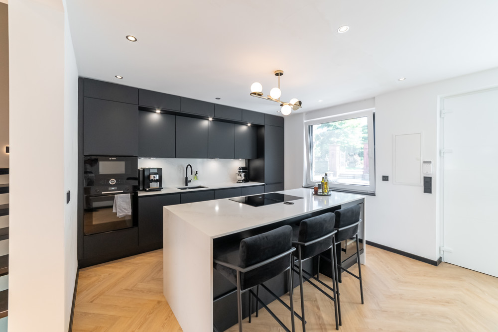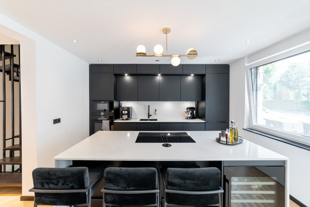 Der erste Eindruck beim Betreten des Hauses: Stilvoll und offen. Sie werden von einer modernen und hochwertigen Einbauküche in schwarz-mattem Design empfangen, die mit allen notwendigen Elektrogeräten von namenhaften Marken ausgestattet ist und sich perfekt in den Raum einfügt. Von der Küche aus erstreckt sich der Blick über das gesamte Erdgeschoss und schafft ein Gefühl von Weite und Offenheit.
