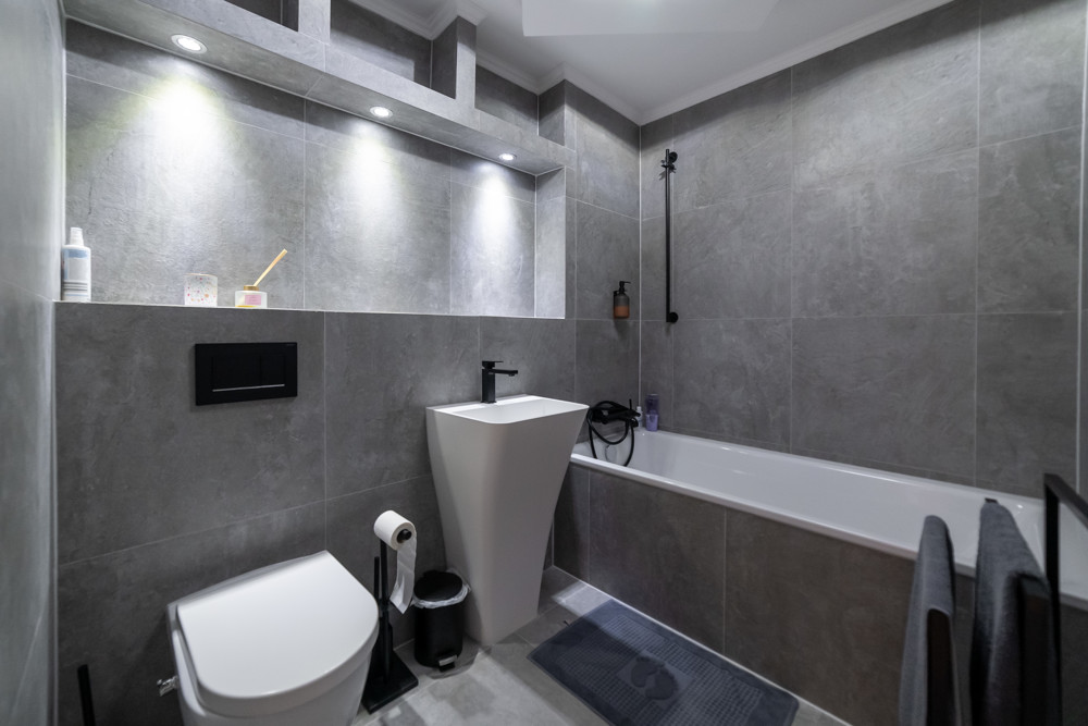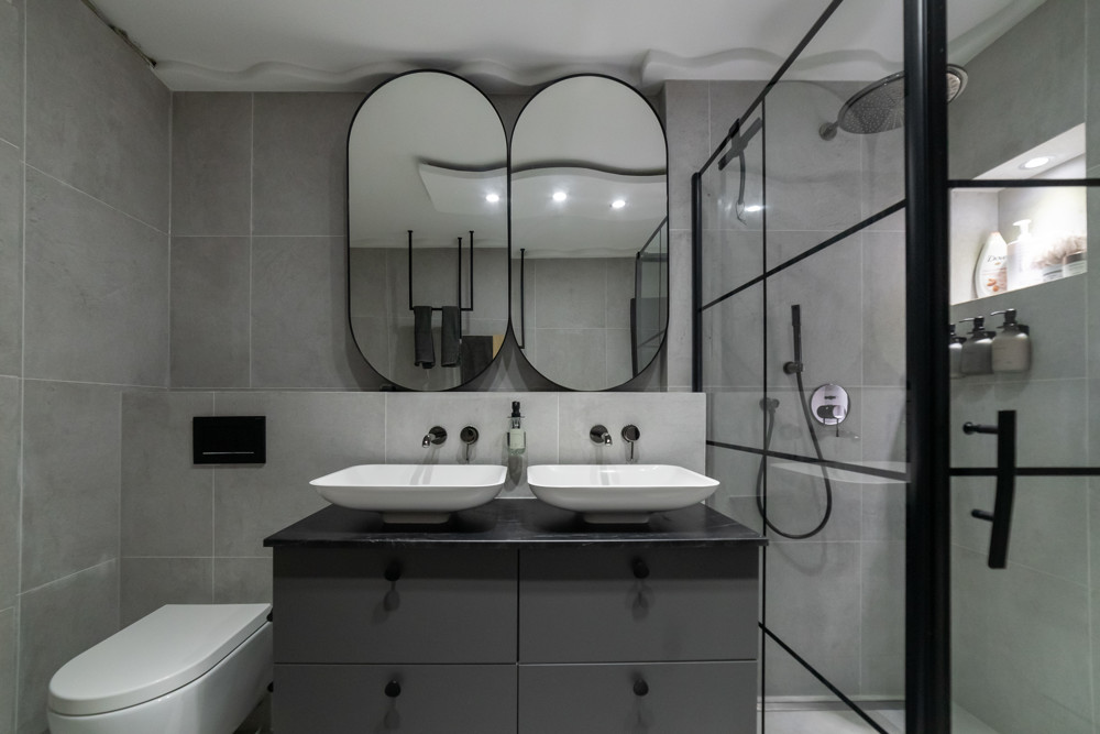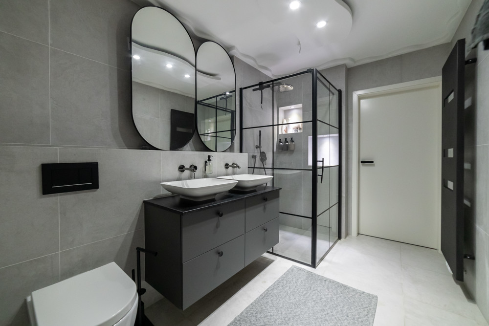 - Deckenhoch geflieste, exklusive Bäder mit mattschwarzen Armaturen