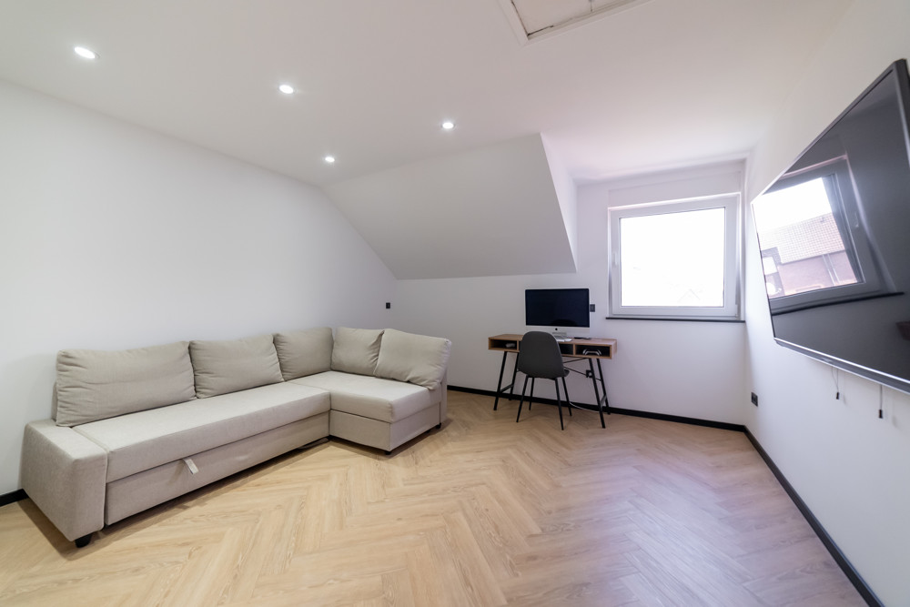 Das Dachgeschoss bietet Ihnen Flexibilität und Platz für Ihre individuellen Bedürfnisse. Die stilvolle Galerie eignet sich perfekt als Arbeitsbereich, Bibliothek oder Rückzugsort. Ein zusätzliches Zimmer kann je nach Wunsch als Gästezimmer, Büro oder Hobbyraum genutzt werden. Der Kreativität sind hier keine Grenzen gesetzt.