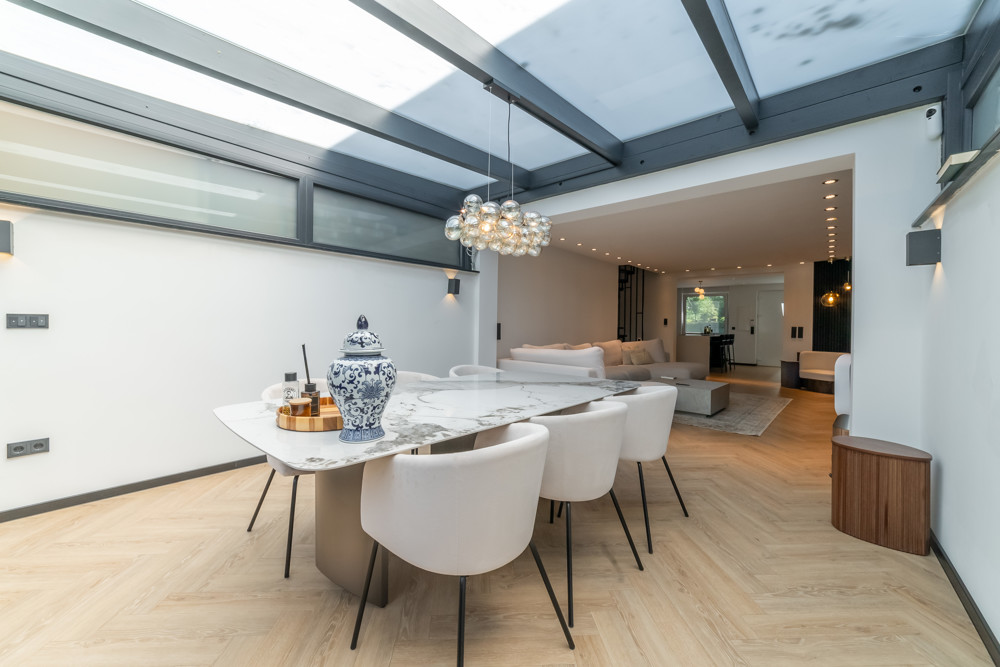 Im großzügigen Wohnzimmer finden sich moderne Holzpaneele, die eine warme und zugleich stilvolle Atmosphäre schaffen. Der angrenzende Essbereich befindet sich im offen gestalteten Wintergarten, der mit seinem lichterfüllten Raum zum Verweilen einlädt. Durch die großen Fensterflächen und den Zugang zur Loggia genießen Sie jederzeit den Blick ins Freie. Von hier aus gelangen Sie auf die geschmackvoll gestaltete Terrasse – Ihr persönlicher Rückzugsort im Freien.