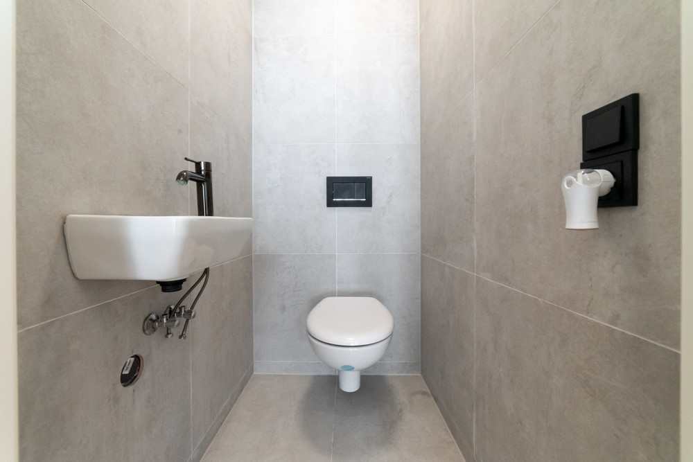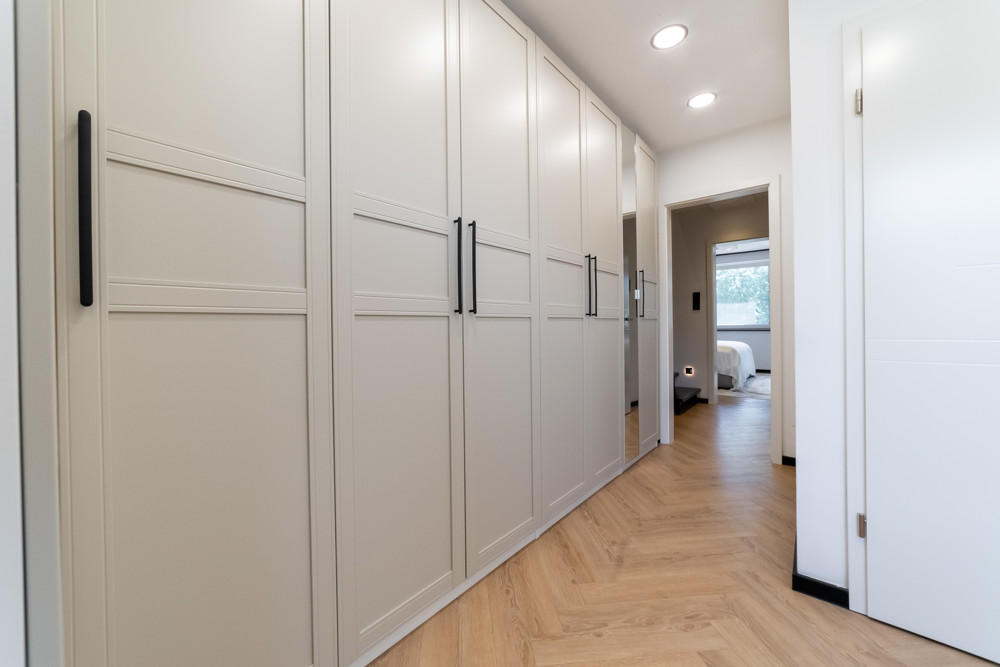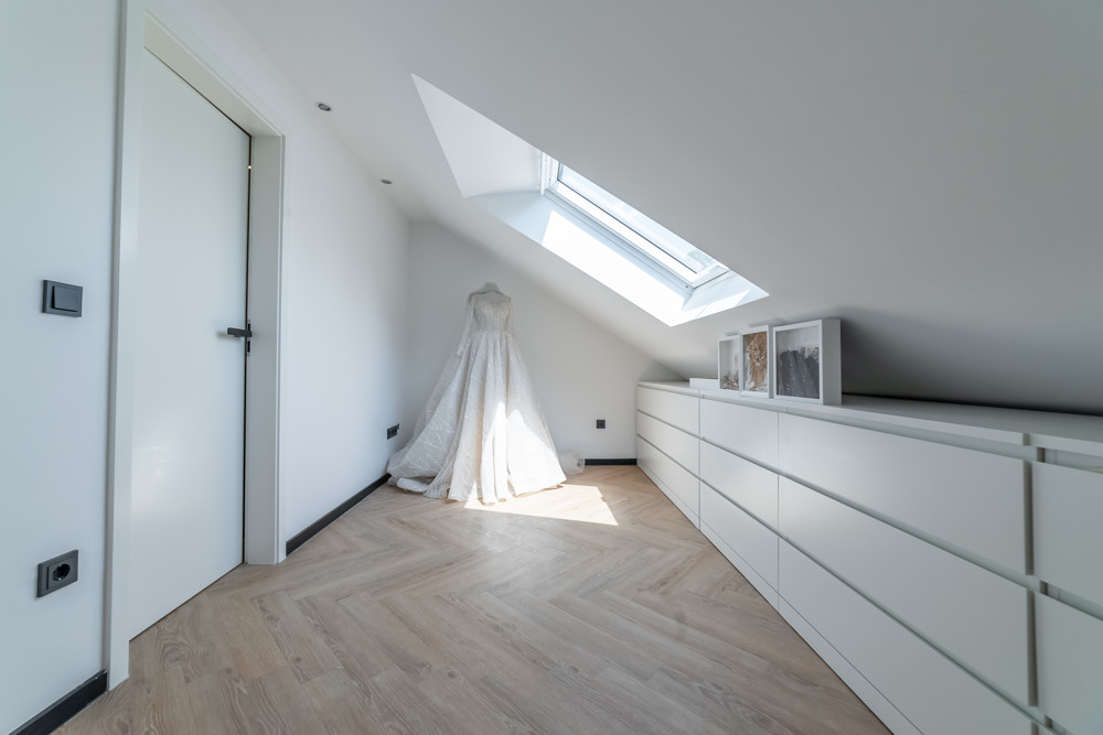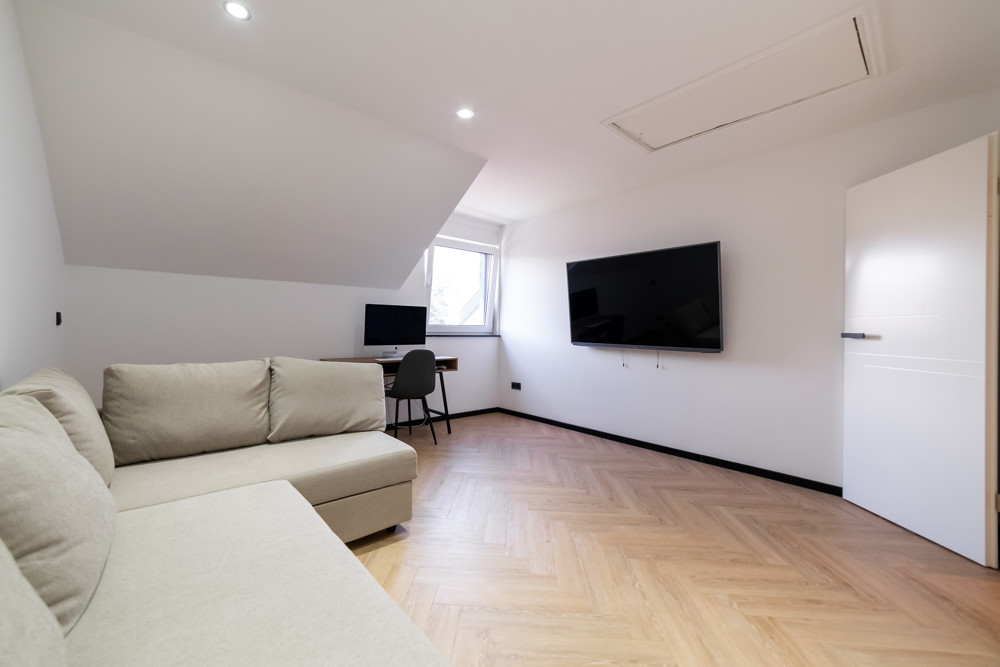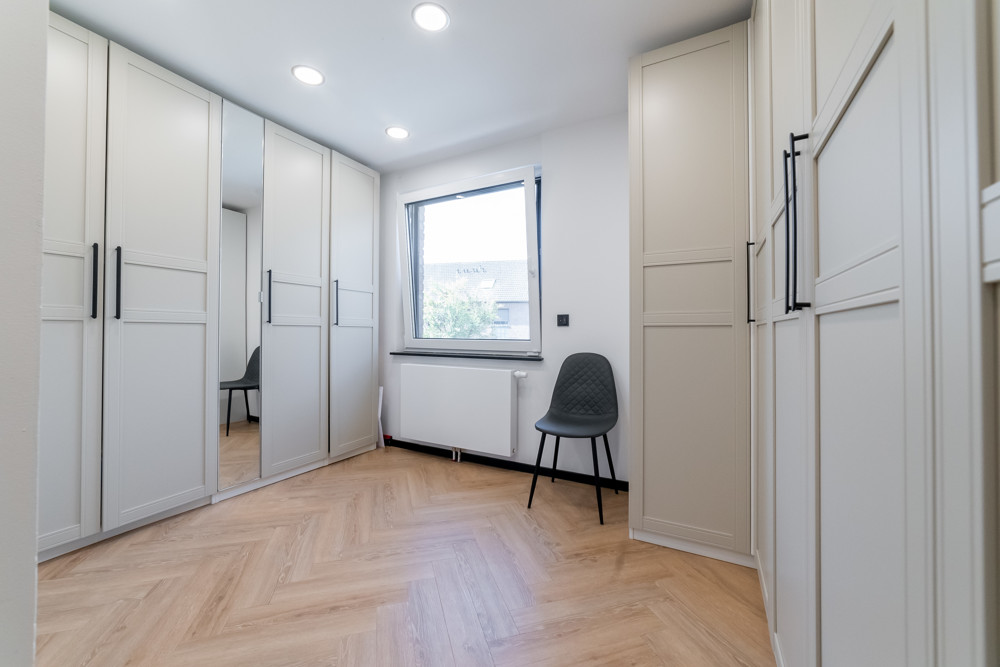 Im Obergeschoss befindet sich das private Refugium des Hauses: Das großzügige Schlafzimmer bietet genügend Platz für erholsame Nächte. Angrenzend dazu liegt ein separates Ankleidezimmer – ein Traum für jeden, der Ordnung und Stil schätzt. Das luxuriöse Badezimmer wurde mit hochwertigen Materialien ausgestattet. Auch hier ziehen sich die eleganten Grautöne und matt-schwarzen Akzente durch, die dem Raum eine moderne, entspannende Atmosphäre verleihen. Um dem Haus die gewisse Wärme zu verleihen, wurde in den Wohnräumen ein farblich abgestimmter Fischgrätenvinyl verlegt.