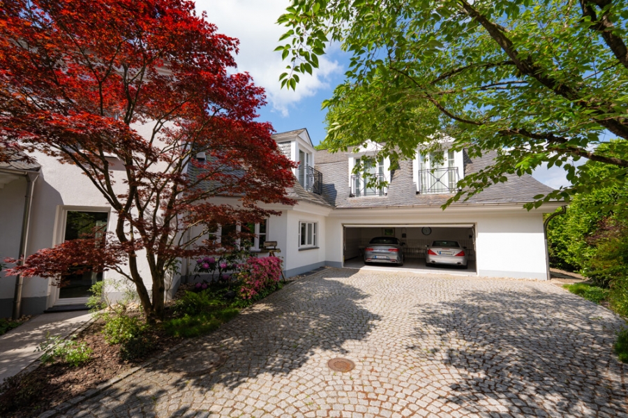 Dieses Anwesen verfügt über eine Doppelgarage, die über einen privaten, elektrisch gesicherten Zugang erschlossen wird. Zusätzlich steht ausreichend Stellfläche vor den Garagen für weitere Fahrzeuge zur Verfügung – komfortabel, diskret und ideal für Besucher oder eine größere Fahrzeugkollektion. Das Haus ist zudem mit einer kompletten Außensicherungs-Alarmanlage ausgestattet, die an einen Wachdienst angeschlossen ist.