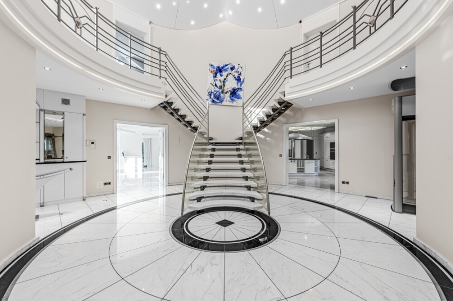 Herzstück des Hauses ist die imposante Eingangshalle mit offener Galerie und repräsentativer Freitreppe – ein Raum von besonderer Wirkung, der Weite, Licht und architektonische Raffinesse auf höchstem Niveau vereint. Ein Personenaufzug verbindet komfortabel das Erdgeschoss mit dem Obergeschoss und unterstreicht den Anspruch an zeitgemäßen Wohnkomfort.