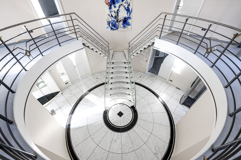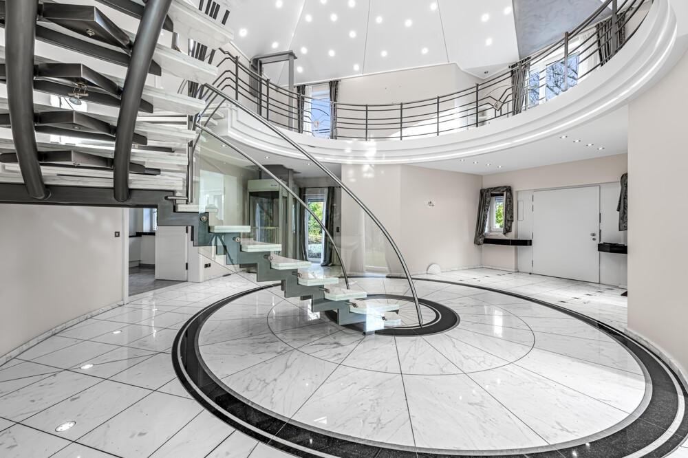 Herzstück des Hauses ist die imposante Eingangshalle mit offener Galerie und repräsentativer Freitreppe – ein Raum von besonderer Wirkung, der Weite, Licht und architektonische Raffinesse auf höchstem Niveau vereint. Ein Personenaufzug verbindet komfortabel das Erdgeschoss mit dem Obergeschoss und unterstreicht den Anspruch an zeitgemäßen Wohnkomfort.