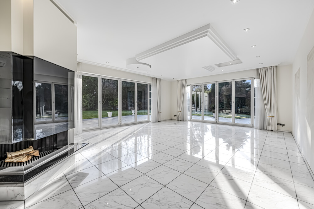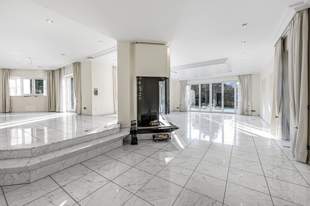 Der großzügige Wohnbereich mit offenem Holzkamin bildet einen emotionalen Mittelpunkt des Hauses. Hier treffen gestalterische Klarheit und wohnliche Eleganz aufeinander. Großformatige, klassische Sprossenfenster verleihen dem Raum eine besondere Tiefe und zeitlose Noblesse, lassen reichlich Tageslicht einströmen und eröffnen idyllische Blickachsen in den parkähnlichen Garten. In Kombination mit dem Kamin entsteht eine warme, einladende Atmosphäre – perfekt für entspannte Abende ebenso wie für stilvolle Empfänge.