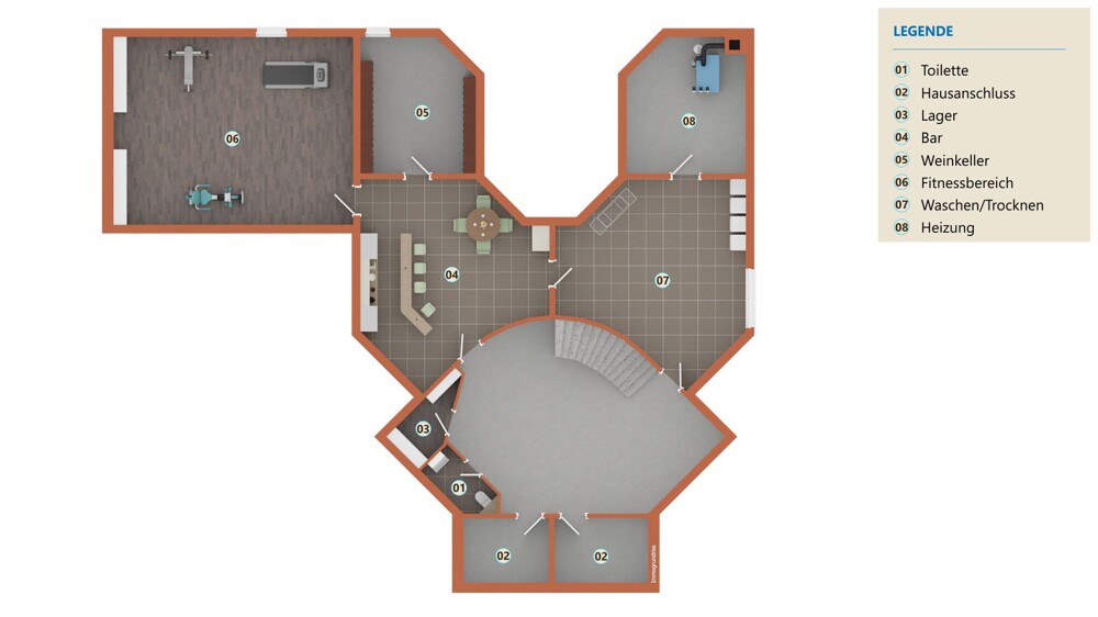 Im Untergeschoss eröffnet sich außergewöhnlich viel Raum für individuelle Nutzungsmöglichkeiten: Großzügige Flächen mit überdurchschnittlicher Deckenhöhe und Fenstern bieten ideale Voraussetzungen für einen Fitnessbereich, Hobbyräume oder weitere wohnähnliche Nutzungen. Ergänzt wird diese Ebene durch einen gekühlten bzw. klimatisierten Raum (ehemals Garderobenraum für Pelze). Zudem bieten weitere Bereiche eine stilvolle Bar, einen exklusiven Weinbereich sowie einen repräsentativen Weinkeller – ein Ort für besondere Abende, private Empfänge und anspruchsvolles Gastgebersein.