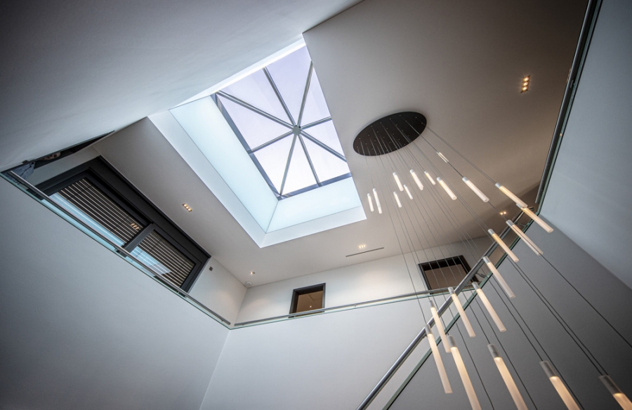 Zwei weitere Zimmer mit separaten Bädern en suite sind über den großzügigen Flurbereich mit Glaskuppel und einer Höhe von 9 Metern zu erreichen. Ein separates Gästezimmer mit eigenem Bad verfügt über weiteren Platz, um zum Beispiel ein Au-pair oder Haushaltshilfe unterzubringen.