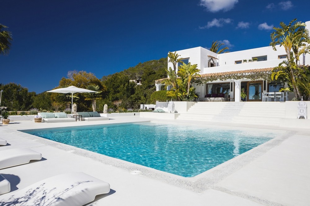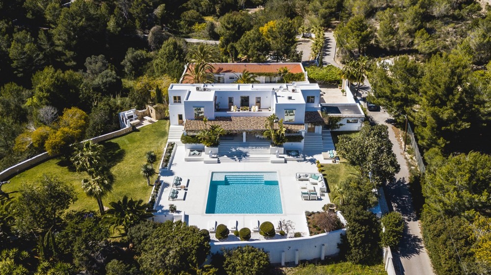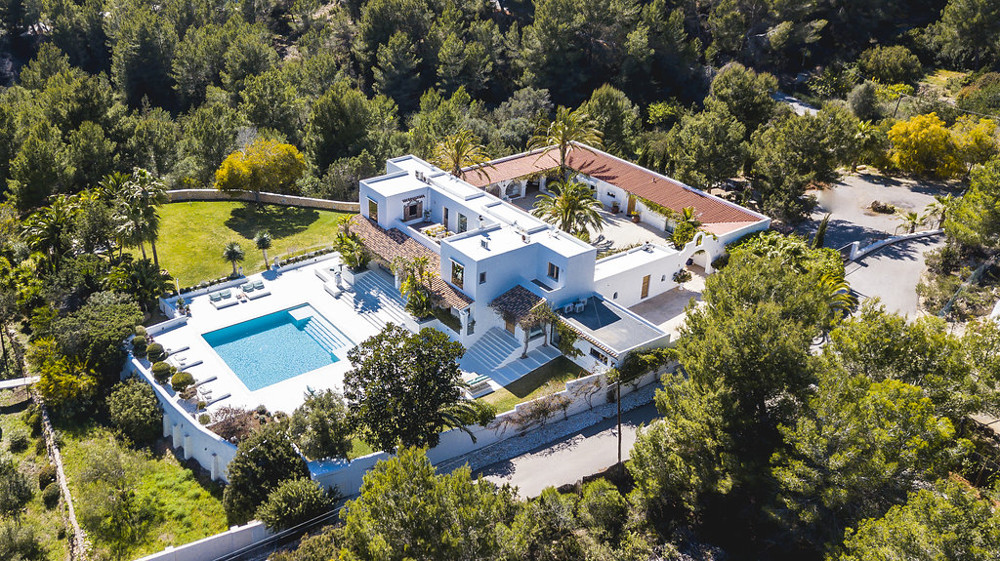 The spectacular villa is located on a hill, only 4 km away from Ibiza town and 5 minutes from the airport. The property is orientated south and has fantastic panoramic sea views on Playa den Bossa, Cap des Falco, Salinas and even to Formentera. The property is 8000 m² and the villa has 450 m² plus a guesthouse 120 m². There are 4 double bedrooms, 4 with bathroom en suite in the main house.