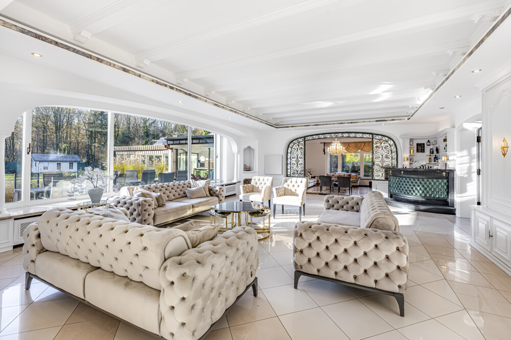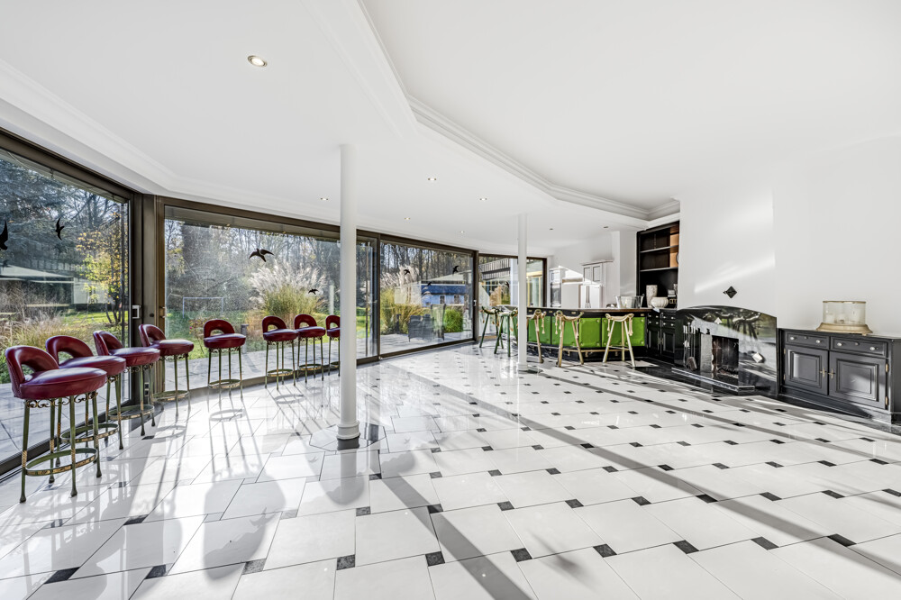 Im Erdgeschoss öffnet sich ein weitläufiger Wohnbereich, der Wärme, Komfort und Stil vereint. Die großzügige Küche, eine Bibliothek, ein lichtdurchfluteter Wintergarten sowie ein Arbeitszimmer fügen sich harmonisch in das offene Raumkonzept ein. Ein absolutes Highlight dieses Geschosses ist die imposante Schwimmhalle – ein luxuriöser Wellnessbereich mit direktem Zugang zur Terrasse und zum Garten. Hier trifft Wohnkomfort auf Rückzugsort, perfekt eingebettet in die Natur des angrenzenden Waldes.