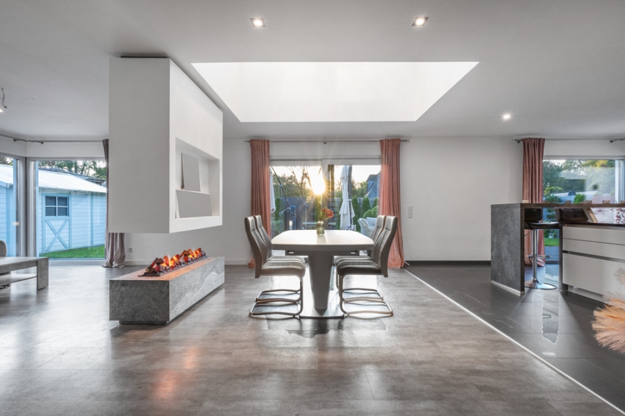 Ein offener Elektrokamin verzaubert das Wohnzimmer mit einer gemütlichen Atmosphäre und lädt Familie und Freunde zu einem Dinner in die angrenzende offene Küche ein.