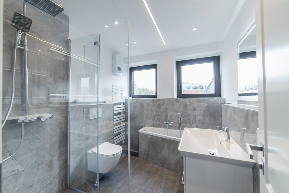 Das Highlight der Wohnung ist das Designerbadezimmer, das mit hochwertigen Materialien von Hansgrohe ausgestattet ist. Es verfügt über eine großzügige Dusche und eine komfortable Badewanne, ideal für entspannende Momente nach einem langen Tag. Zwei Fenster sorgen für Tageslicht und Belüftungsmöglichkeiten, während stilvolle Fliesen das Badezimmer zu einem echten Hingucker machen.