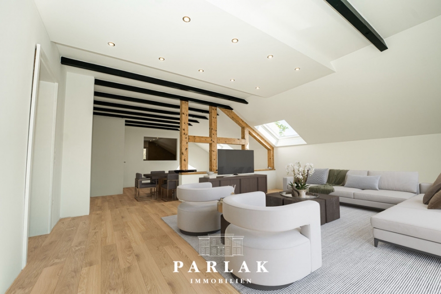 Das Highlight ist mit ca. 42,00 m² das lichtdurchflutete Wohnzimmer, das durch charmante Holzbalken abgetrennt zum Essbereich ist. Die eingebauten Deckenspots tragen hier zu der einzigartigen Wohlfühlatmosphäre bei.