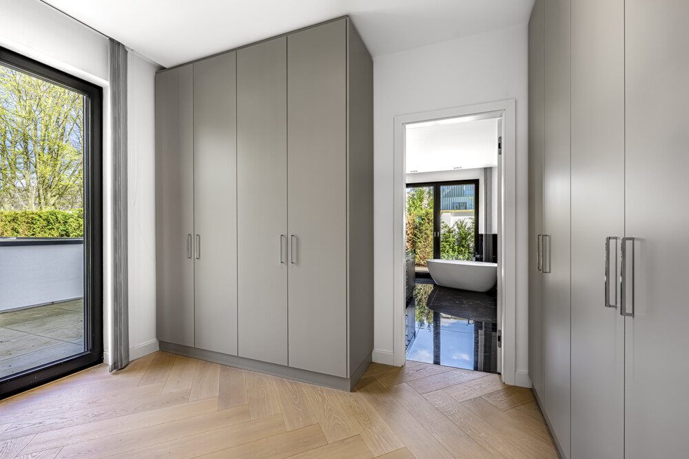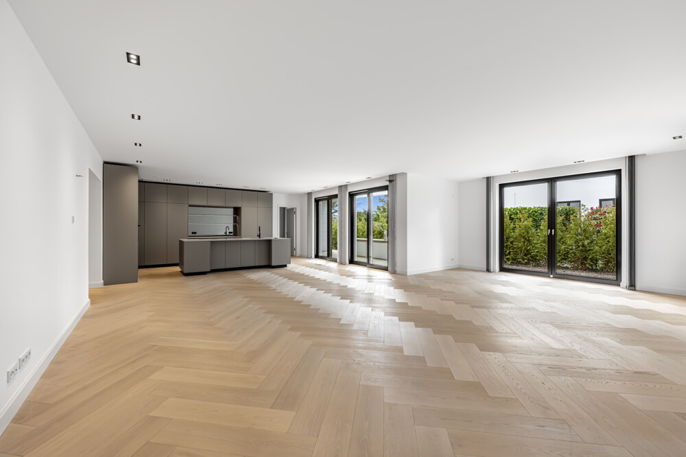 Offene Wohnküchen mit maßgefertigten Einbauten von Molteni und modernster Miele-Gerätetechnik verbinden Ästhetik mit Funktionalität auf höchstem Niveau. Die Bäder überzeugen mit Armaturen von Dornbracht, freistehenden Designerwannen, bodengleichen Duschen und hochwertigen Doppelwaschtischen. Ergänzt wird das Interior durch maßgefertigte Einbauschränke, fein abgestimmte Schalterprogramme und zahlreiche exklusive Details.