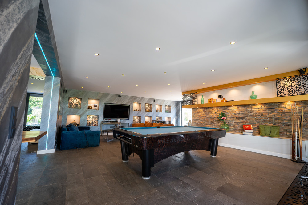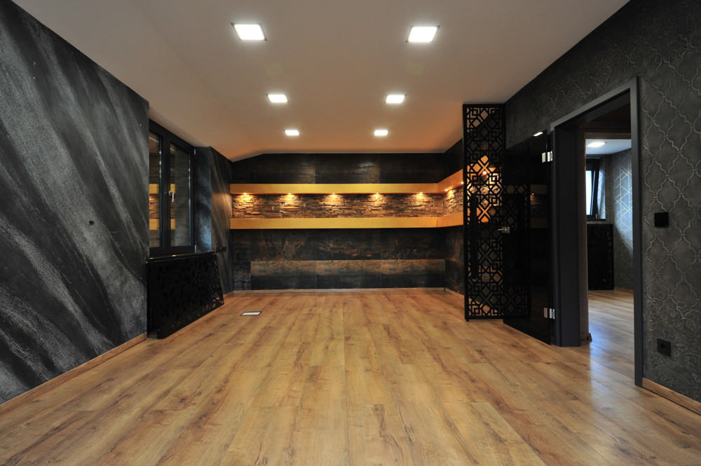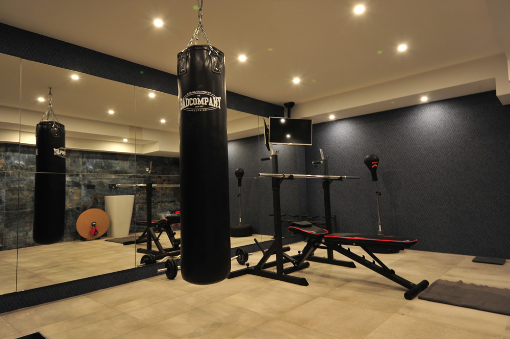 Im wohnähnlichen Untergeschoss gibt es ein weiteres Zimmer, welcher als Schlafraum genutzt wird, und einen weiteren Bereich, der als Fitnessraum dient.