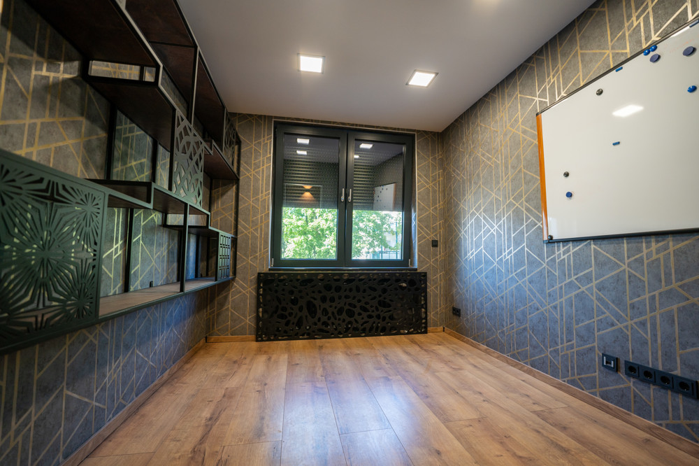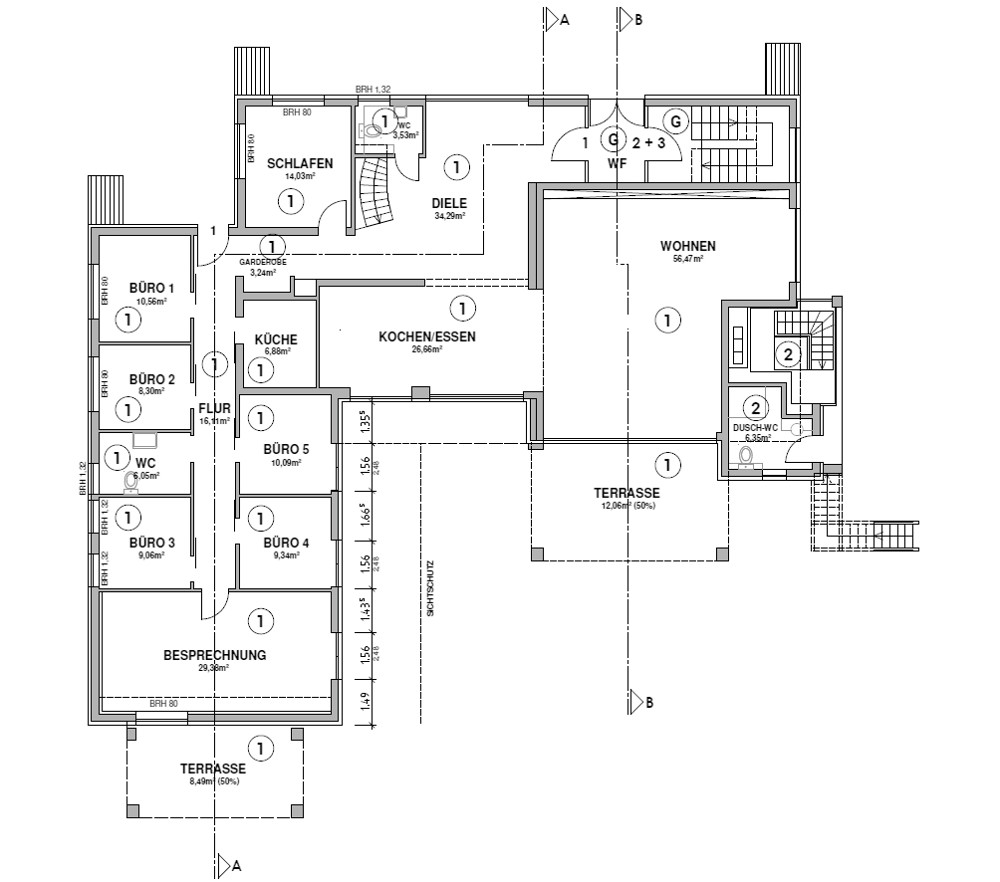 Ein weiteres Highlight der Wohnung ist der separate Eingang zu den Büroräumen, die ebenfalls über eine Terrasse verfügen. Mit einer Bürofläche von ca. 120 m² bietet dieser Bereich ausreichend Platz für individuelle Arbeitsmöglichkeiten.