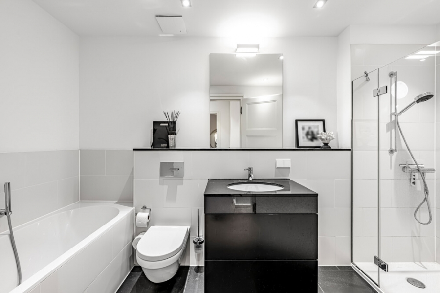 • Hochwertig ausgestattetes Masterbad mit Badewanne und Dusche